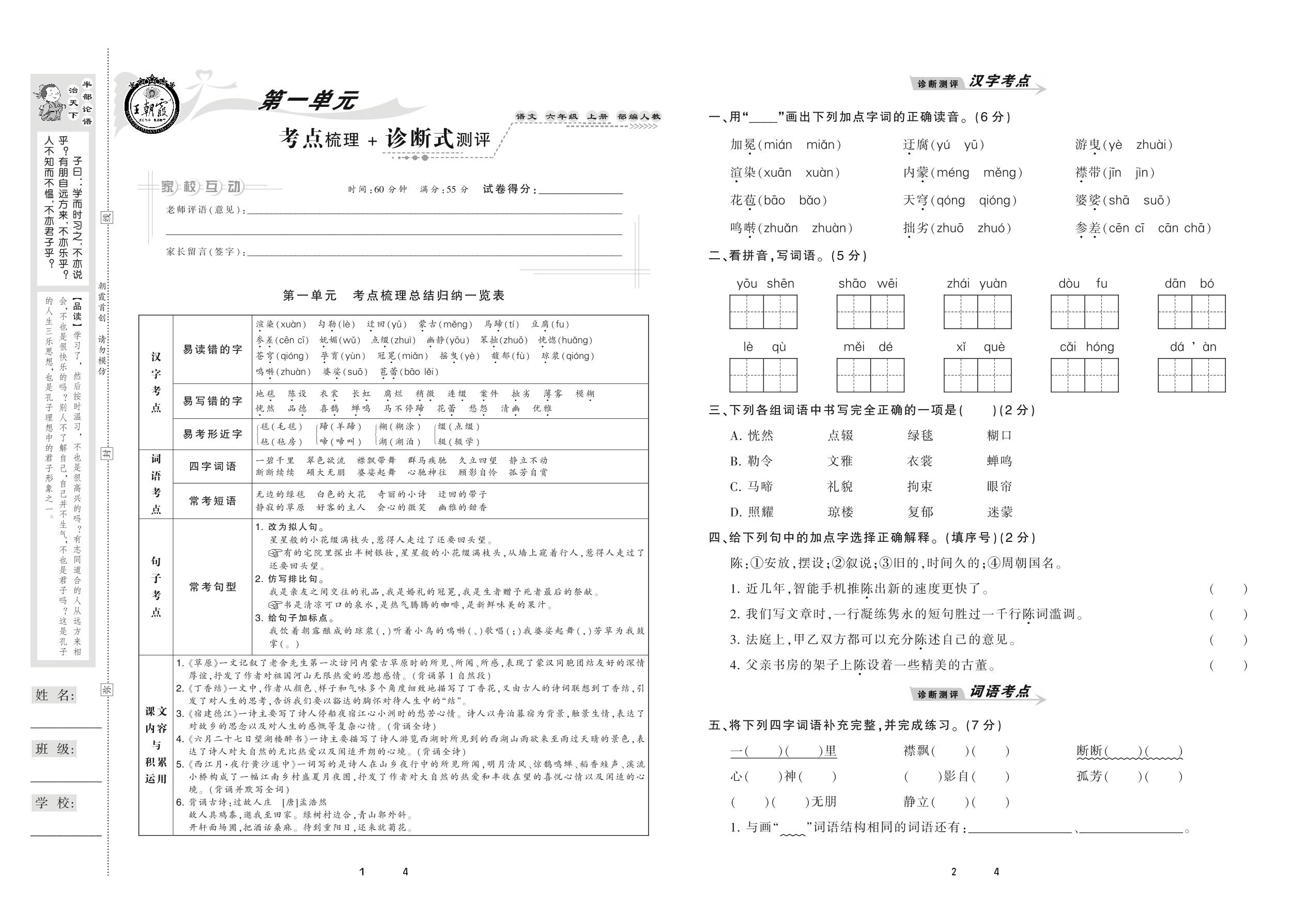 2020上册六年级语文人教版 第一单元 考点梳理+诊断式测评
