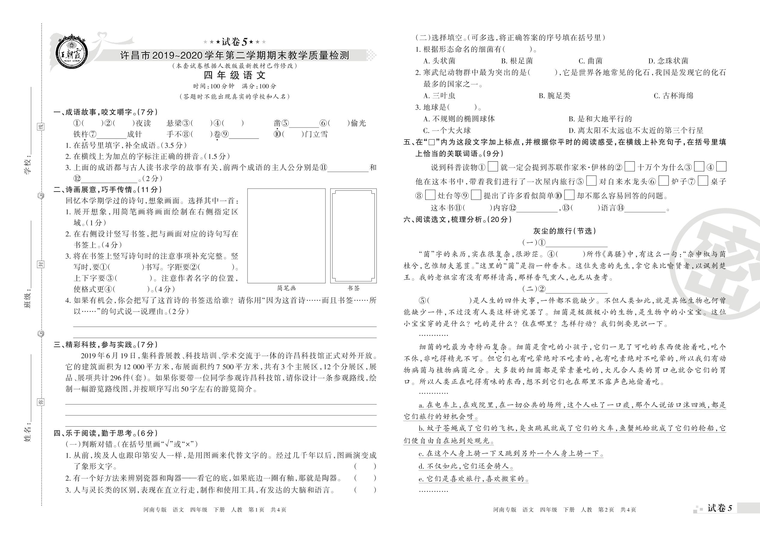 2019-2020学年第二学期许昌市四年级语文试卷(人教版)【5】