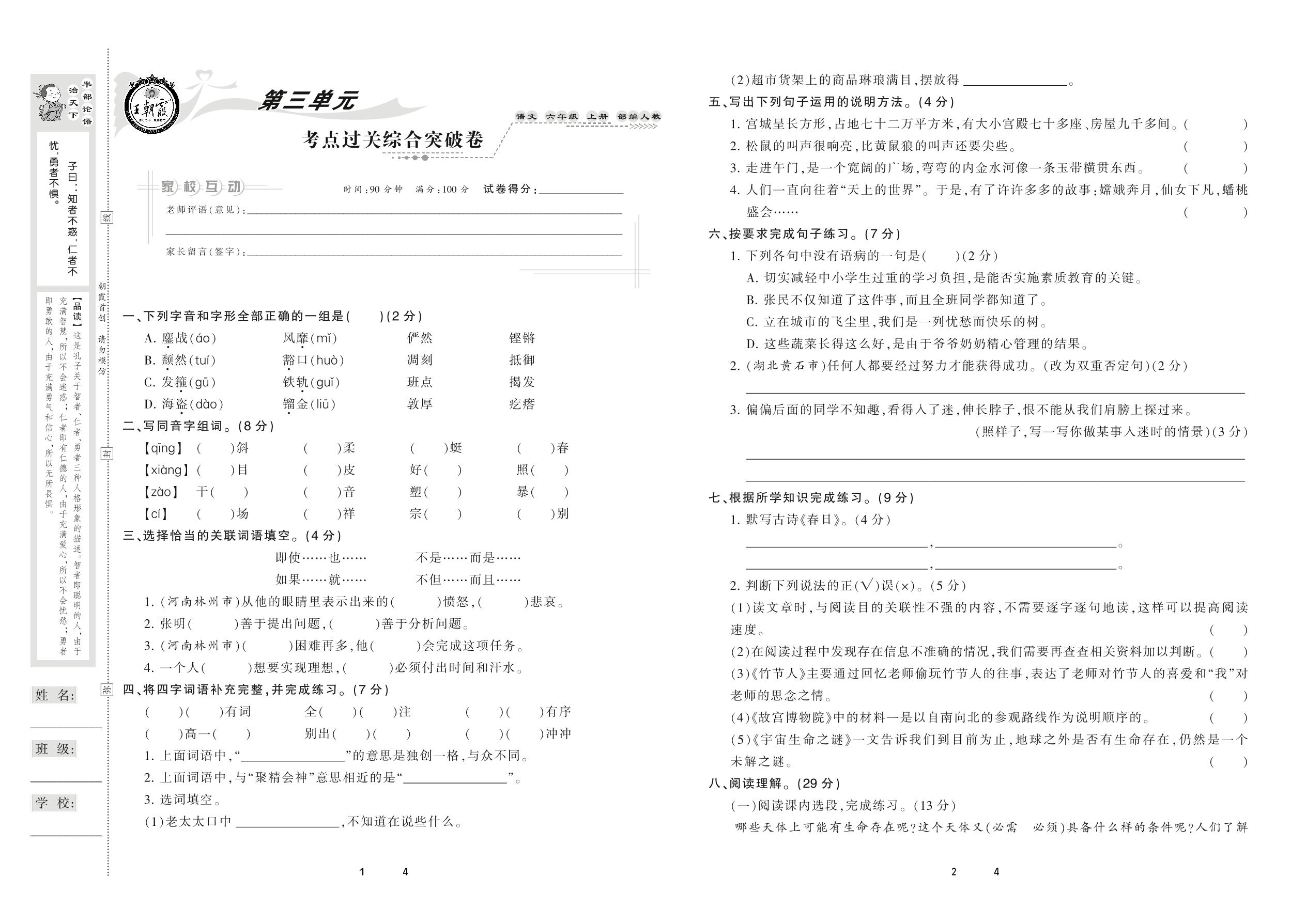 2020上册六年级语文人教版 第三单元 考点过关综合突破卷