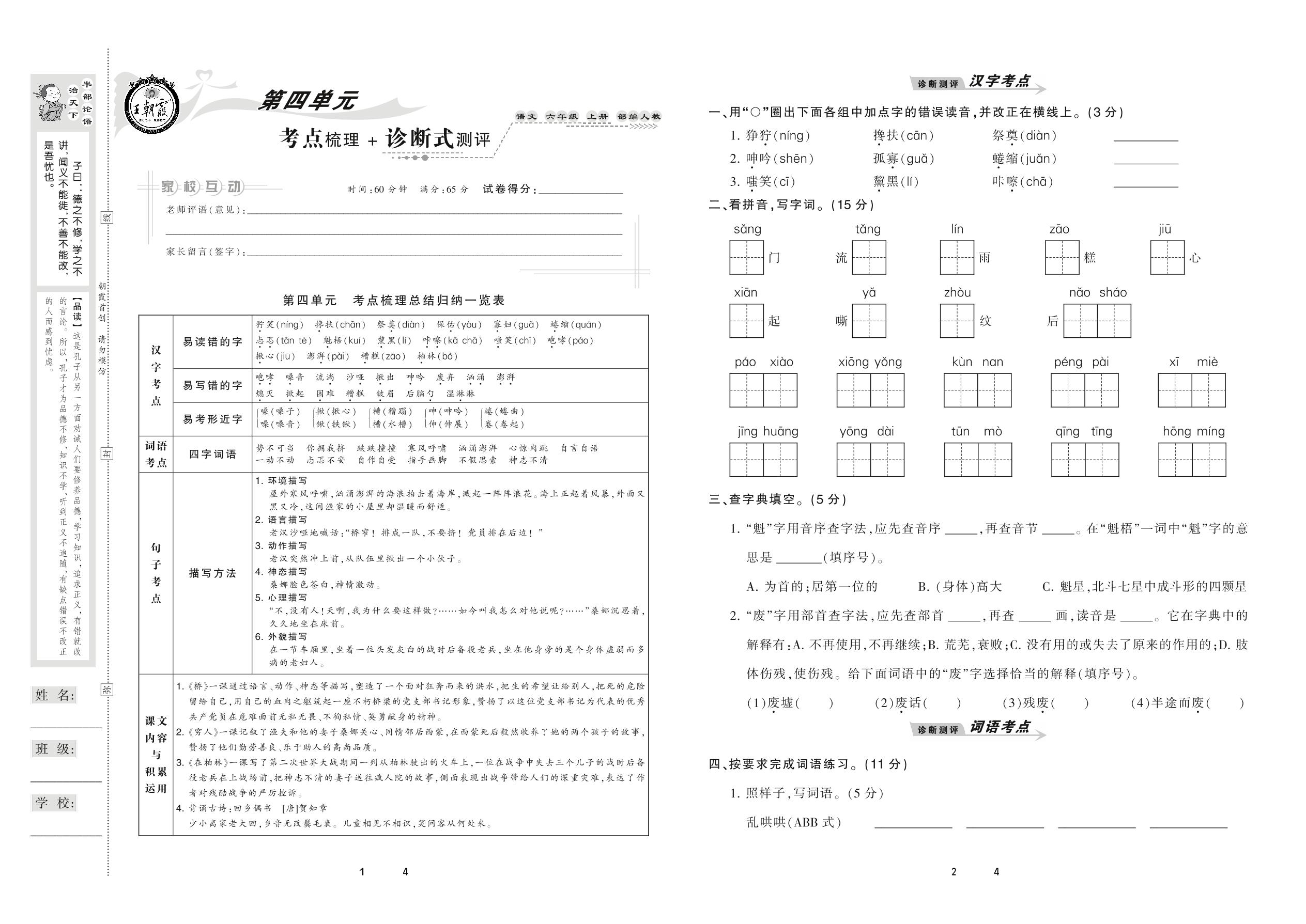 2020上册六年级语文人教版 第四单元 考点梳理+诊断式测评