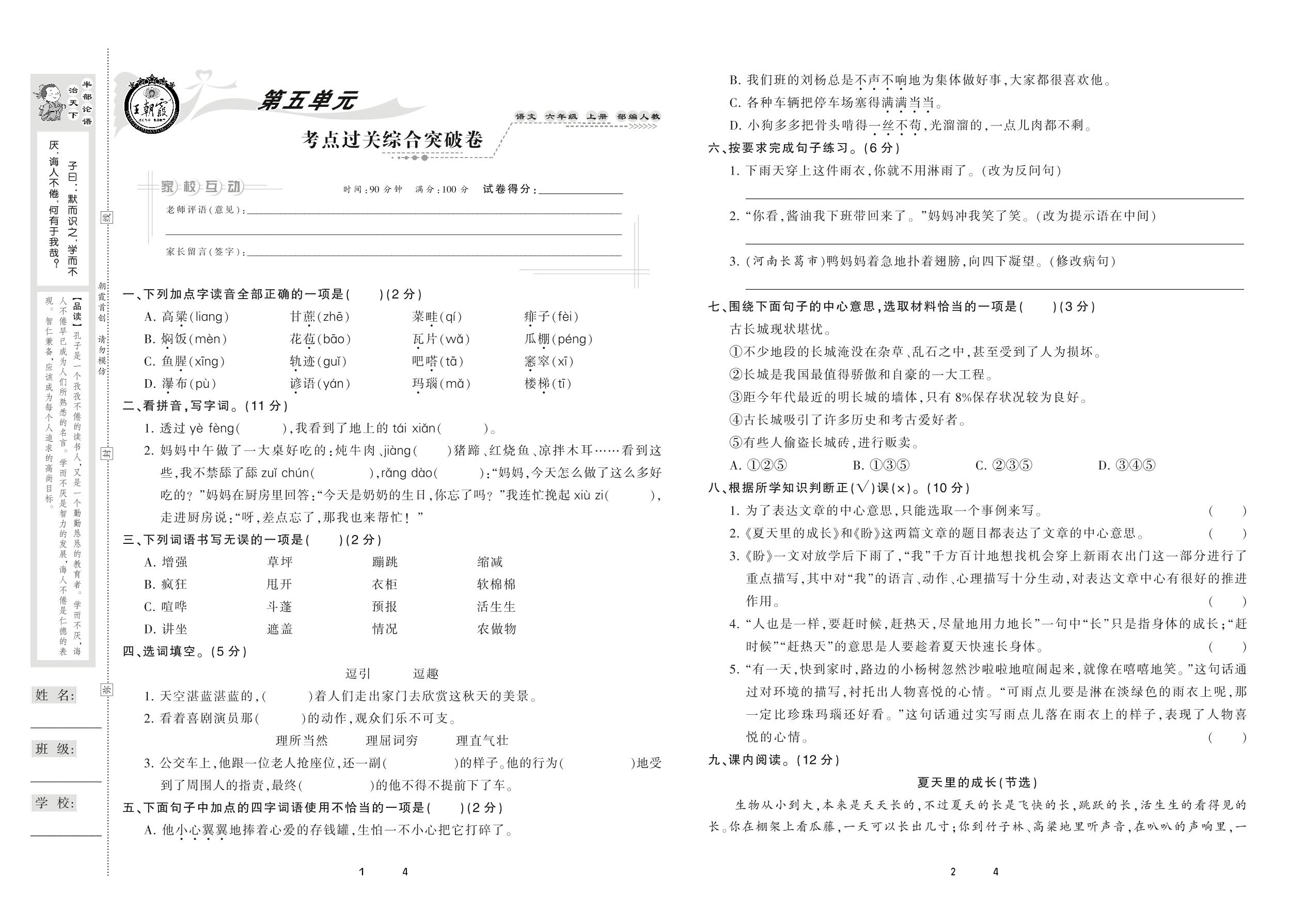 2020上册六年级语文人教版 第五单元 考点过关综合突破卷
