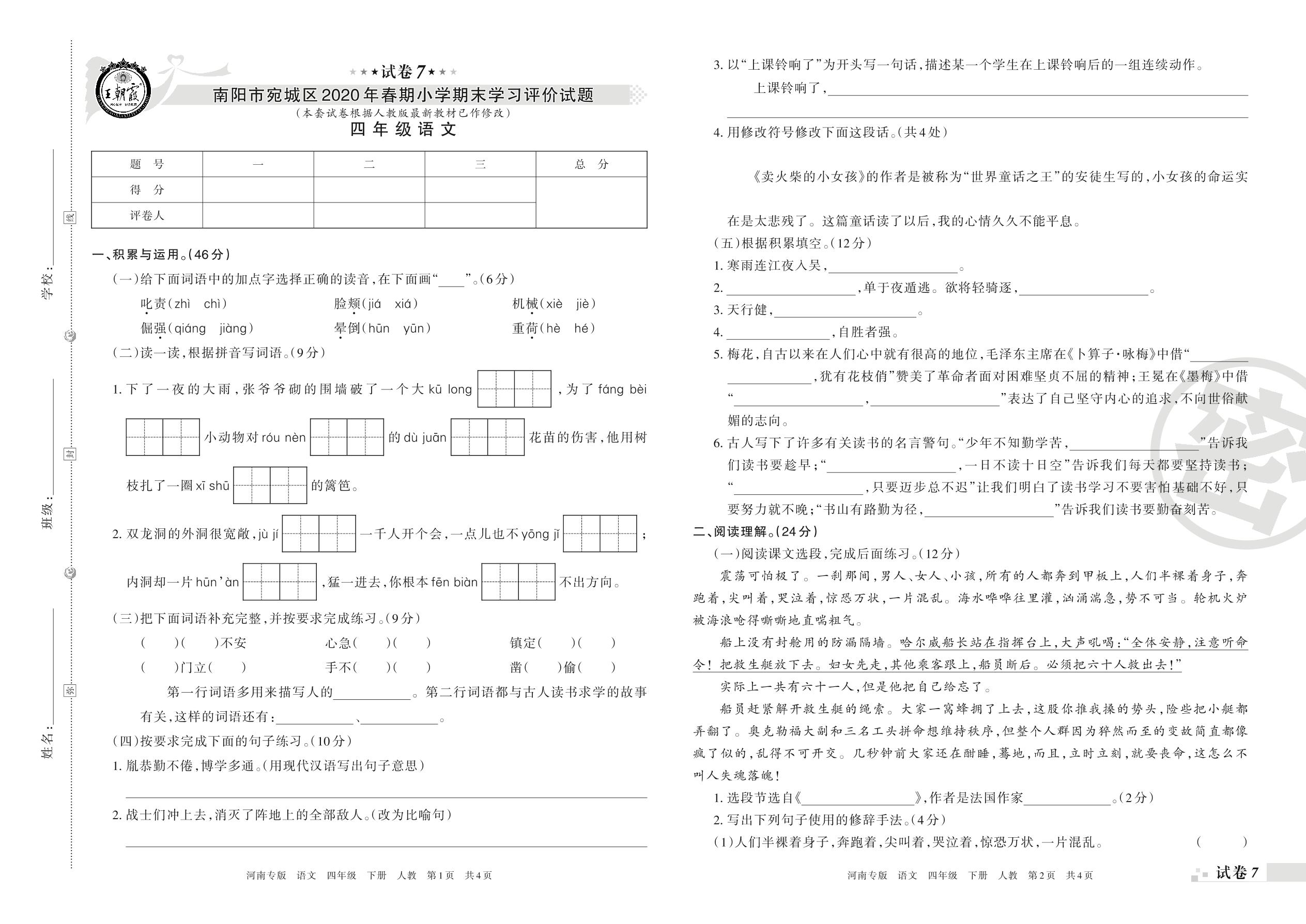 2019-2020学年第二学期南阳市宛城区四年级语文试卷(人教版)【7】