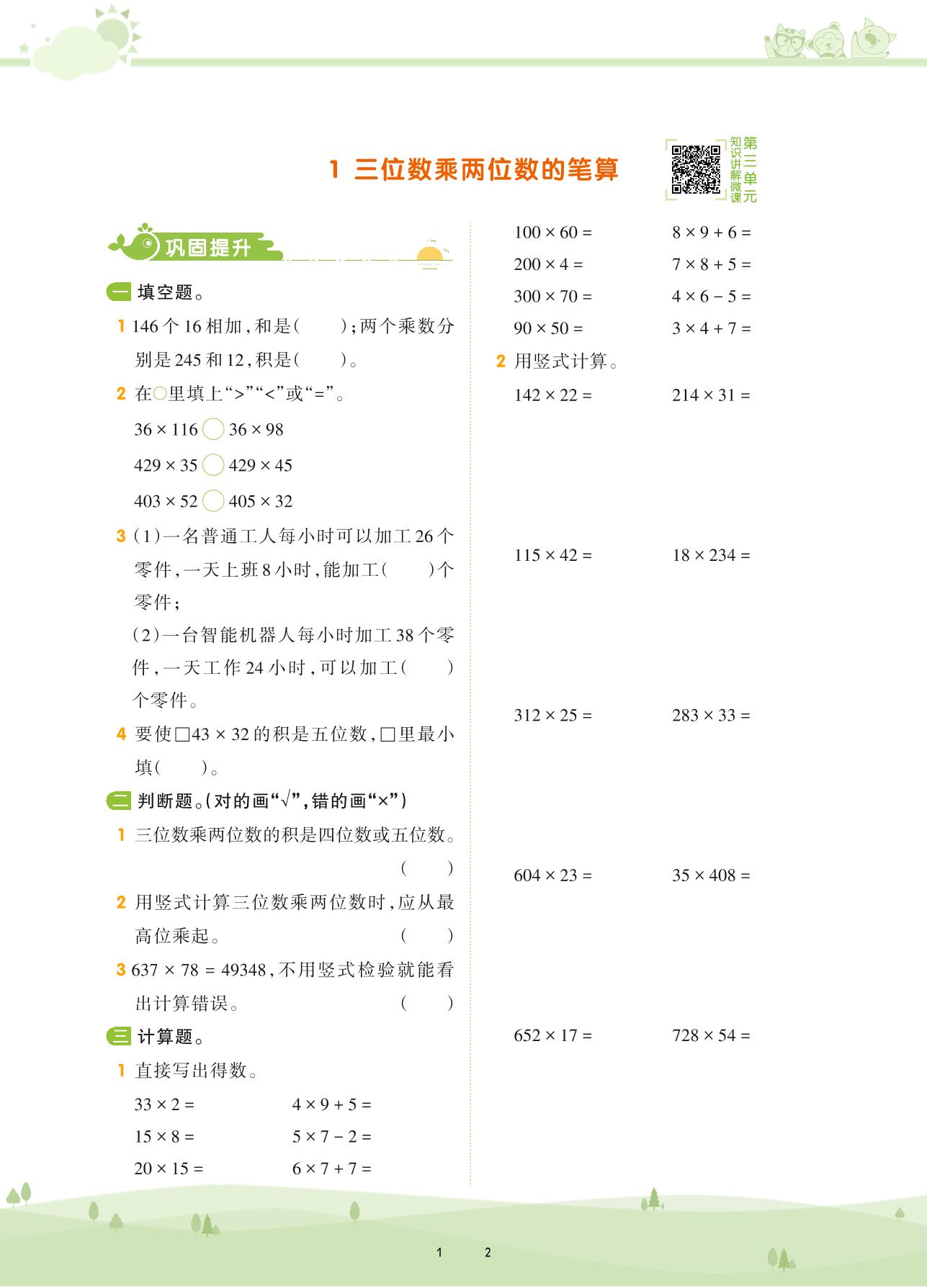 2021下册四年级数学苏教版 第三单元 三位数乘两位数——1 三位数乘两位数的笔算