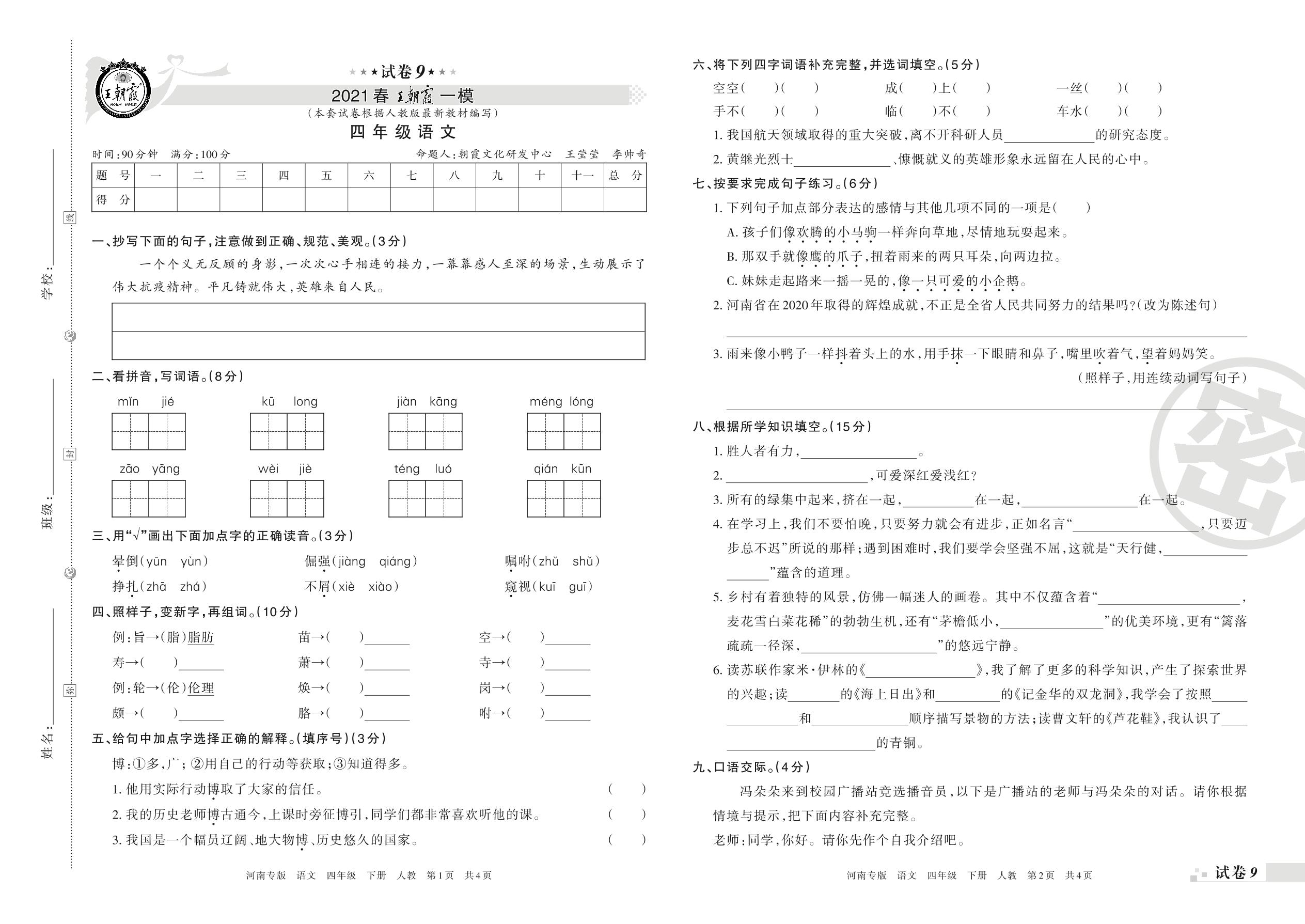 王朝霞期末模拟卷四年级下册语文(人教版)_R210801182944【9】