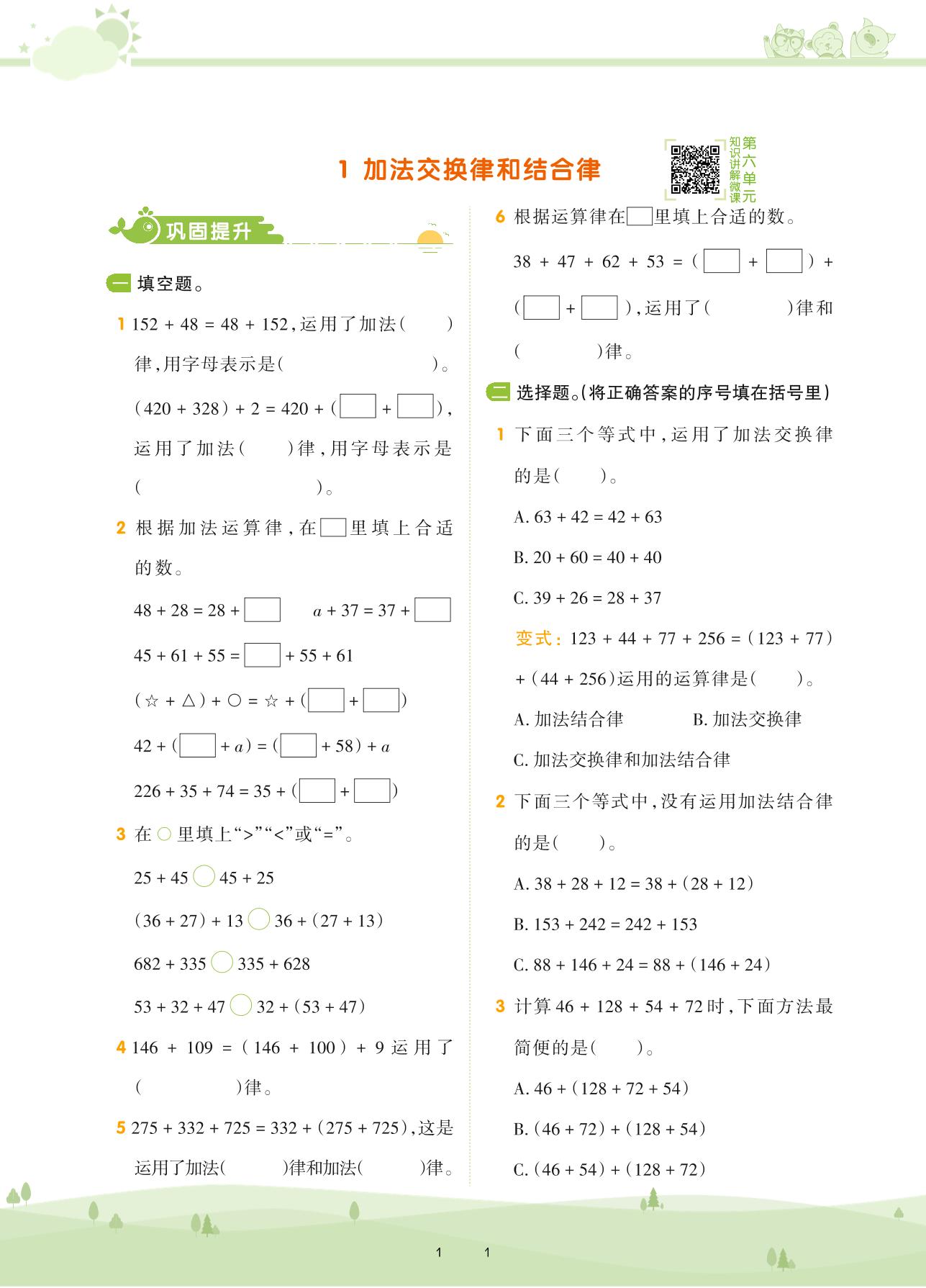 2021下册四年级数学苏教版 第六单元 运算律——1 加法交换律和结合律