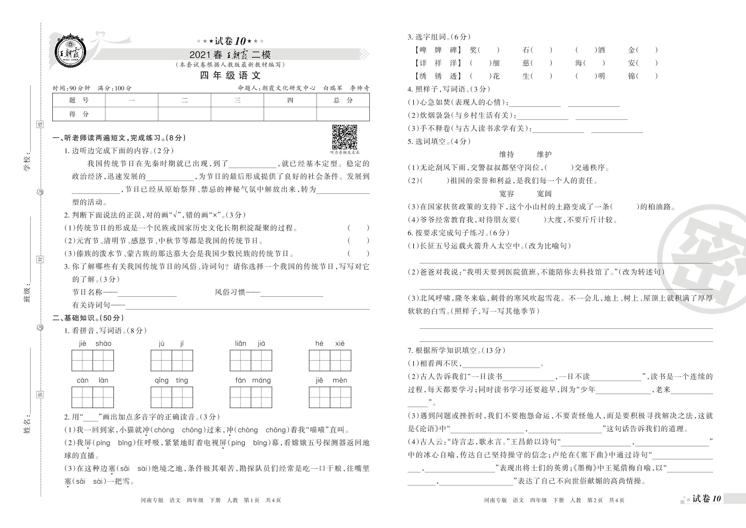 王朝霞期末模拟卷四年级下册语文(人教版)_R210801182948【10】