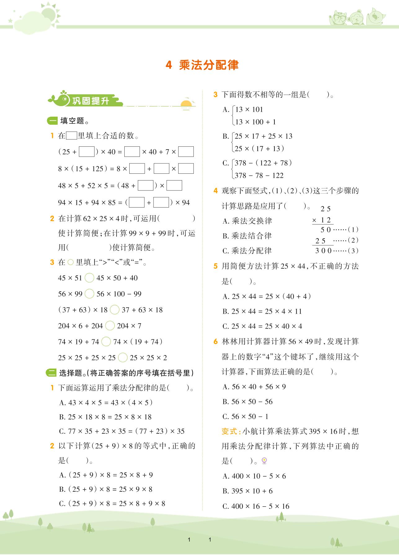 2021下册四年级数学苏教版 第六单元 运算律——4 乘法分配律