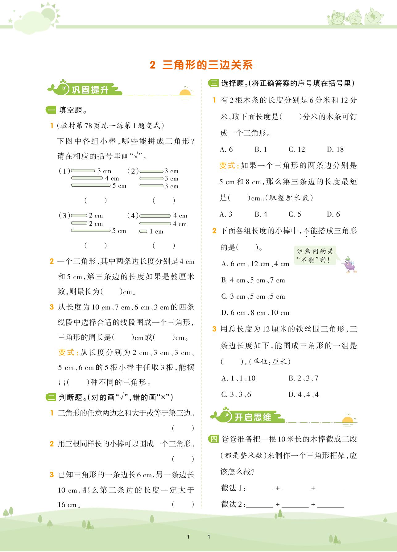 2021下册四年级数学苏教版 第七单元 三角形、平行四边形和梯形——2 三角形的三边关系
