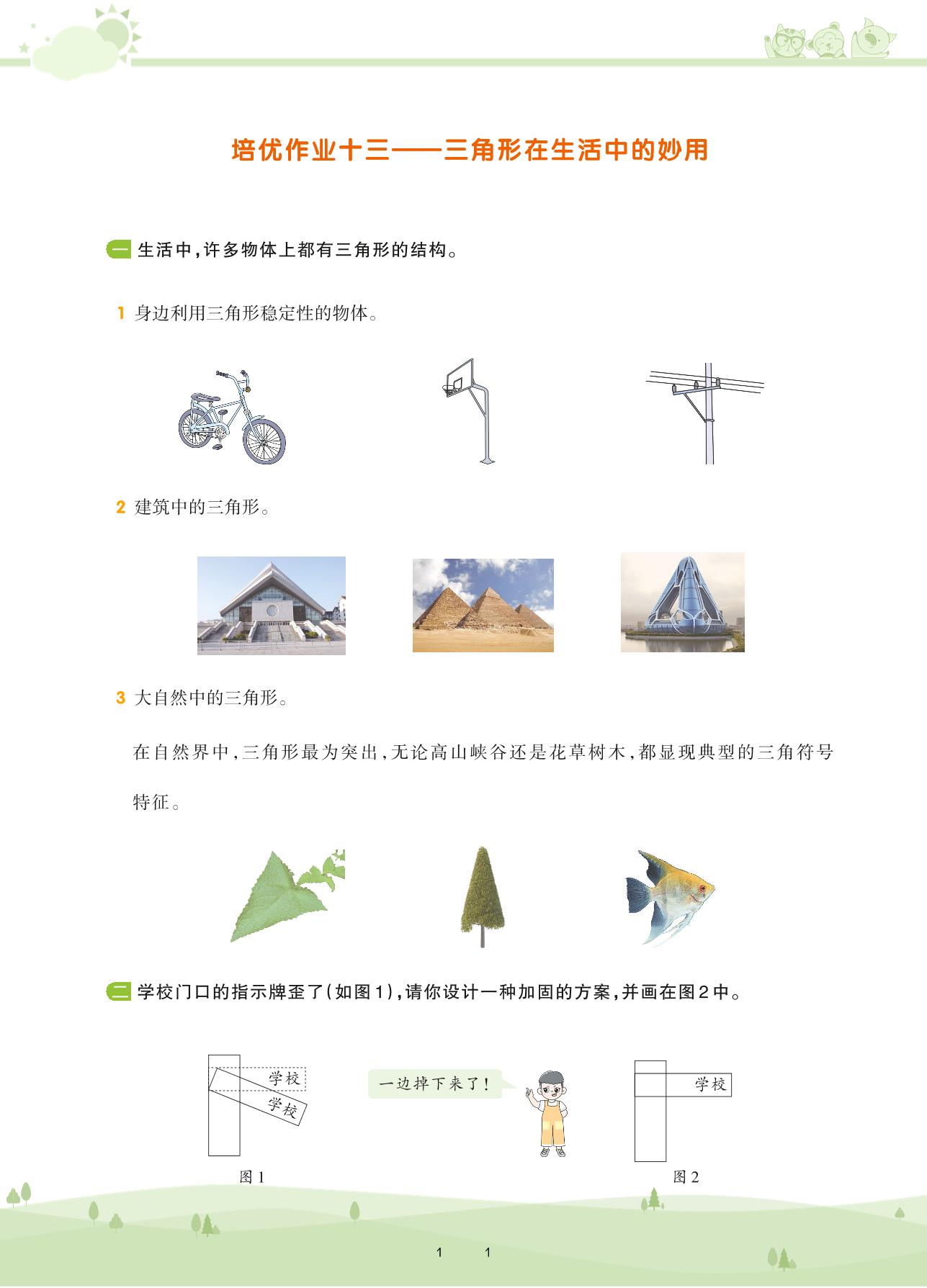 2021下册四年级数学苏教版 第七单元 三角形、平行四边形和梯形——培优作业十三 三角形在生活中的妙用