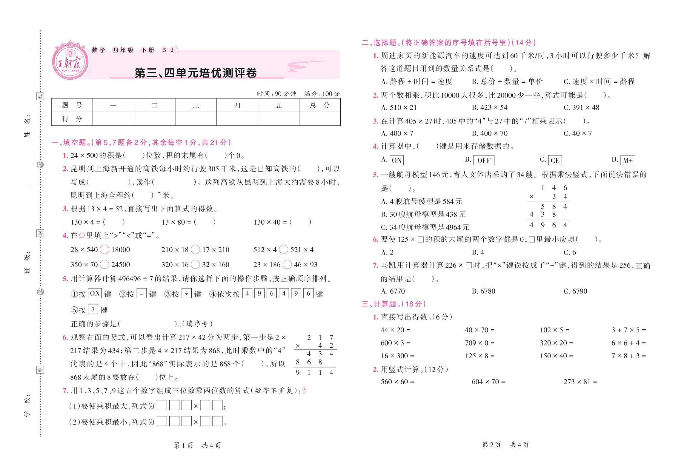 2021下册四年级数学苏教版 第三、四单元培优测评卷