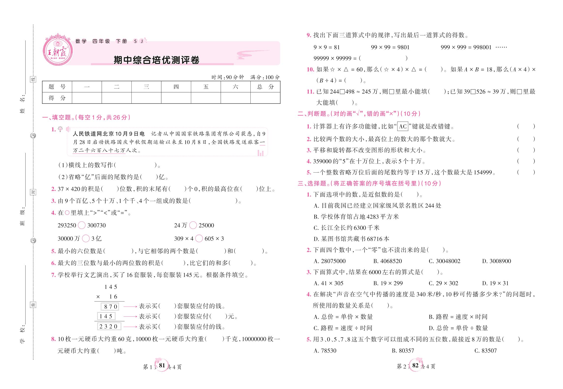 四年级数学苏教版下册期中卷
