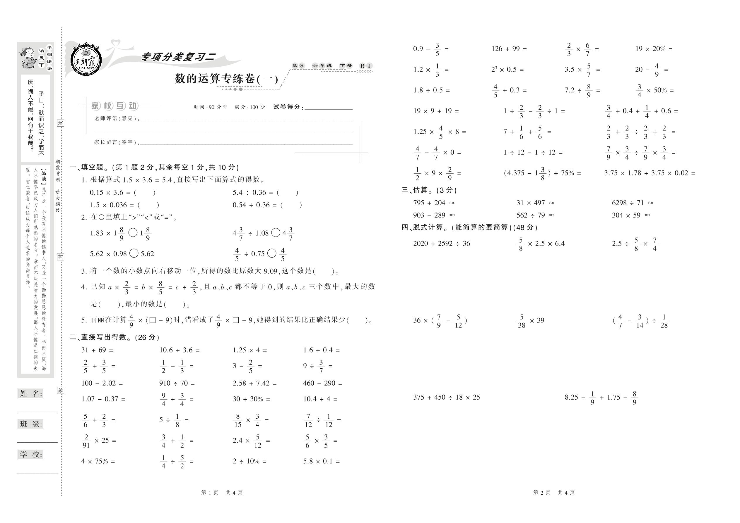 2021下册六年级数学人教版 数的运算专练卷(一)
