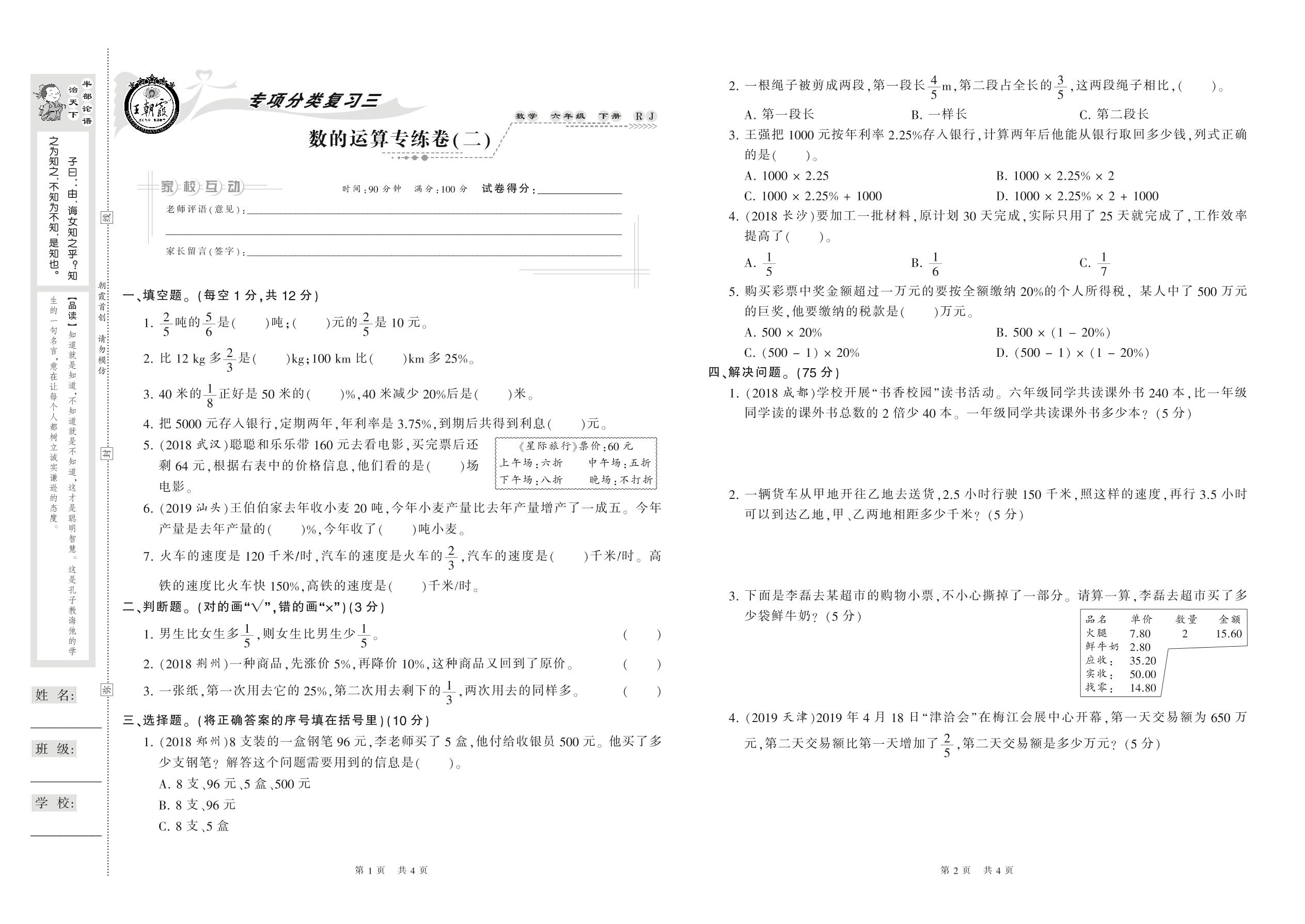 2021下册六年级数学人教版 数的运算专练卷(二)