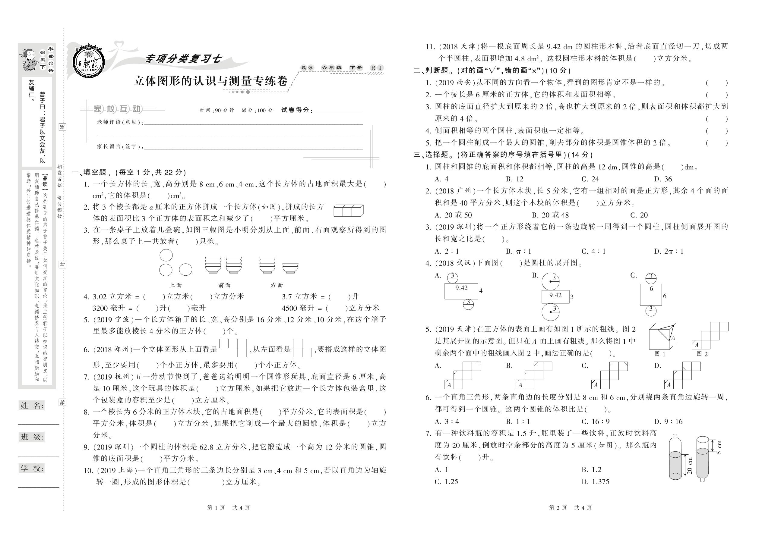 2021下册六年级数学人教版 立体图形的认识与测量专练卷