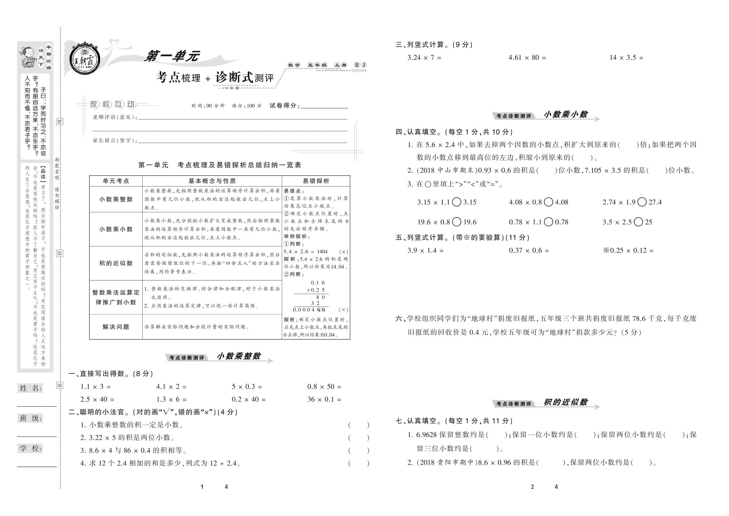 2020上册五年级数学人教版 第一单元 考点梳理+诊断式测评