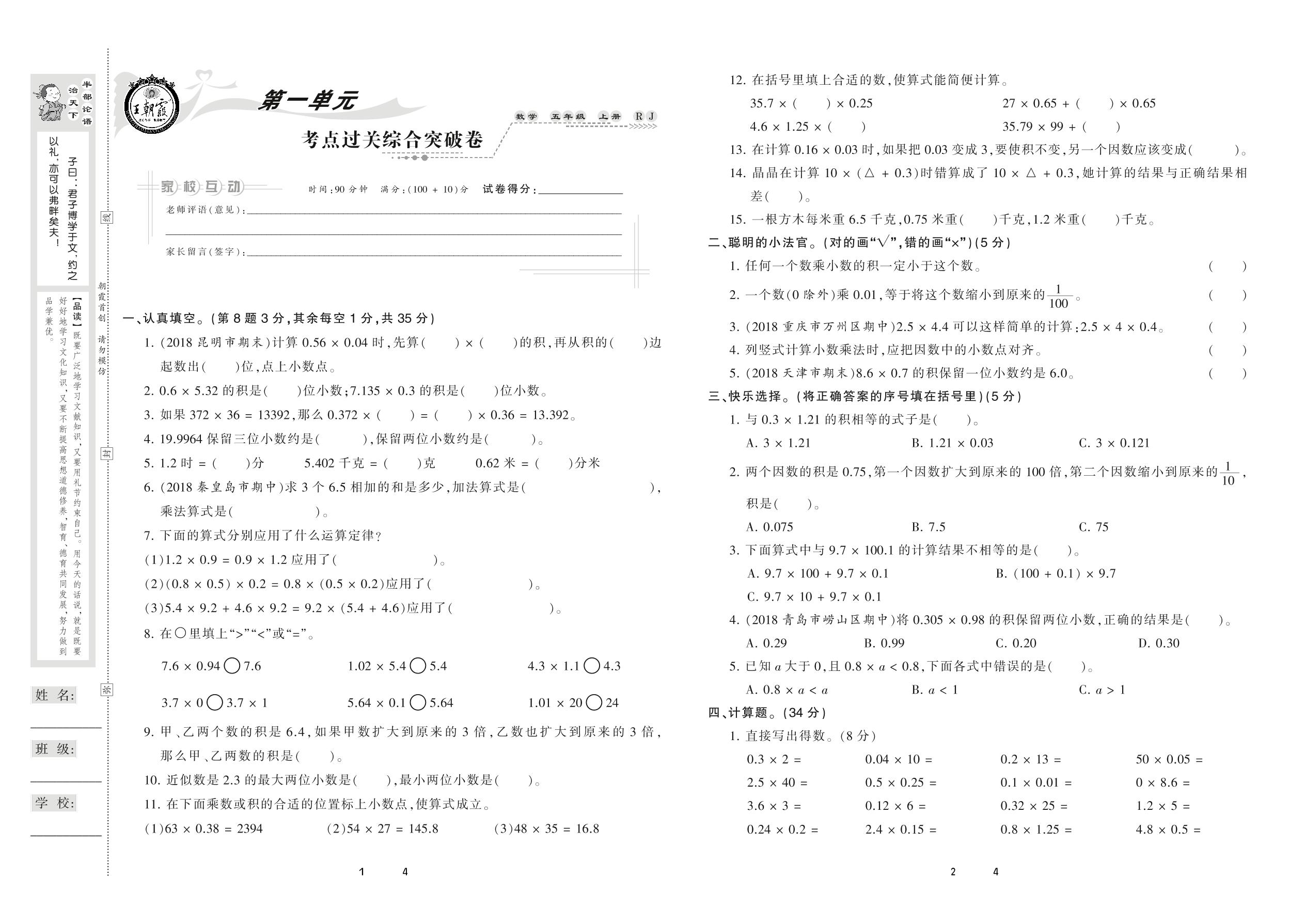 2020上册五年级数学人教版 第一单元 考点过关综合突破卷