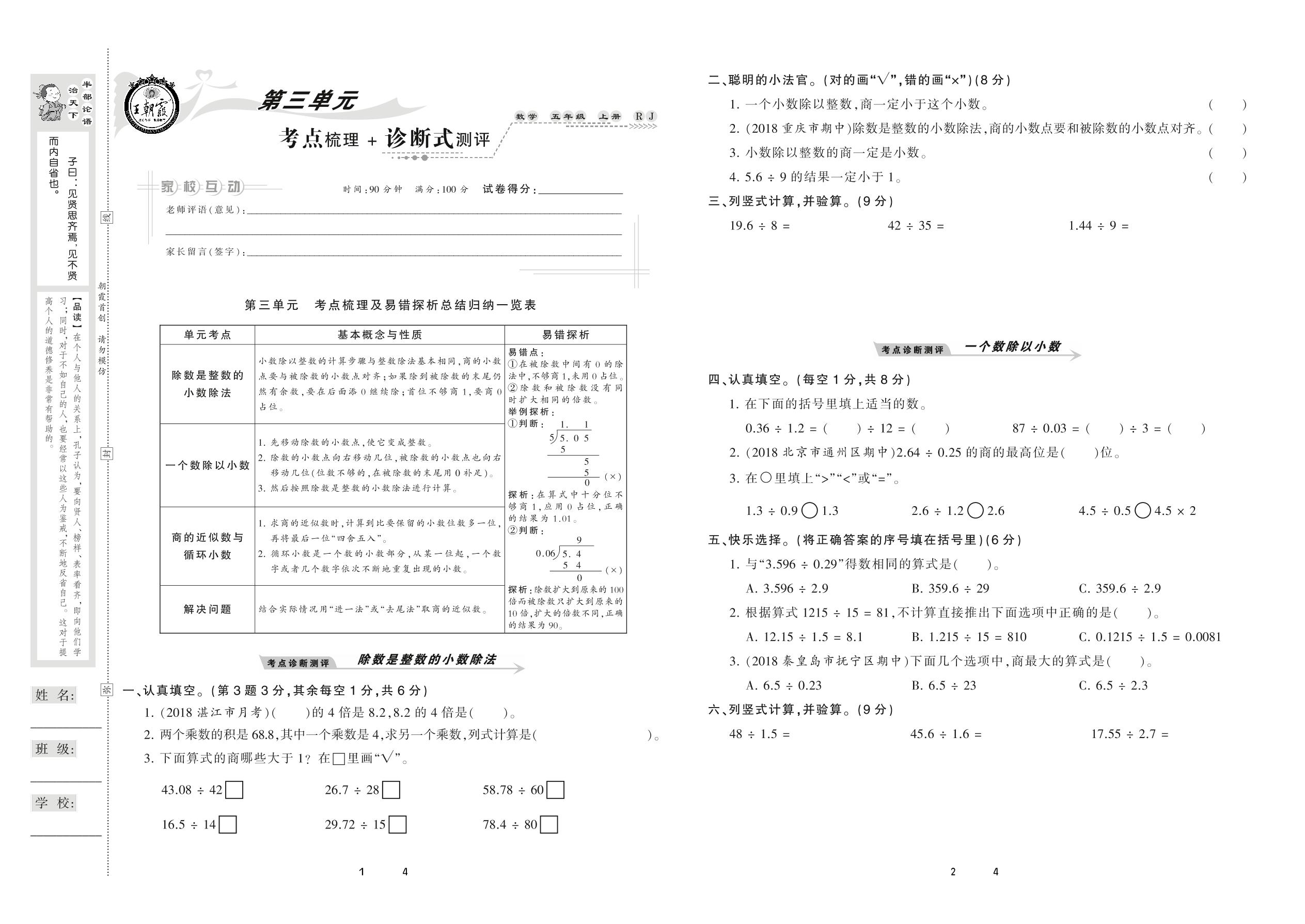 2020上册五年级数学人教版 第三单元 考点梳理+诊断式测评