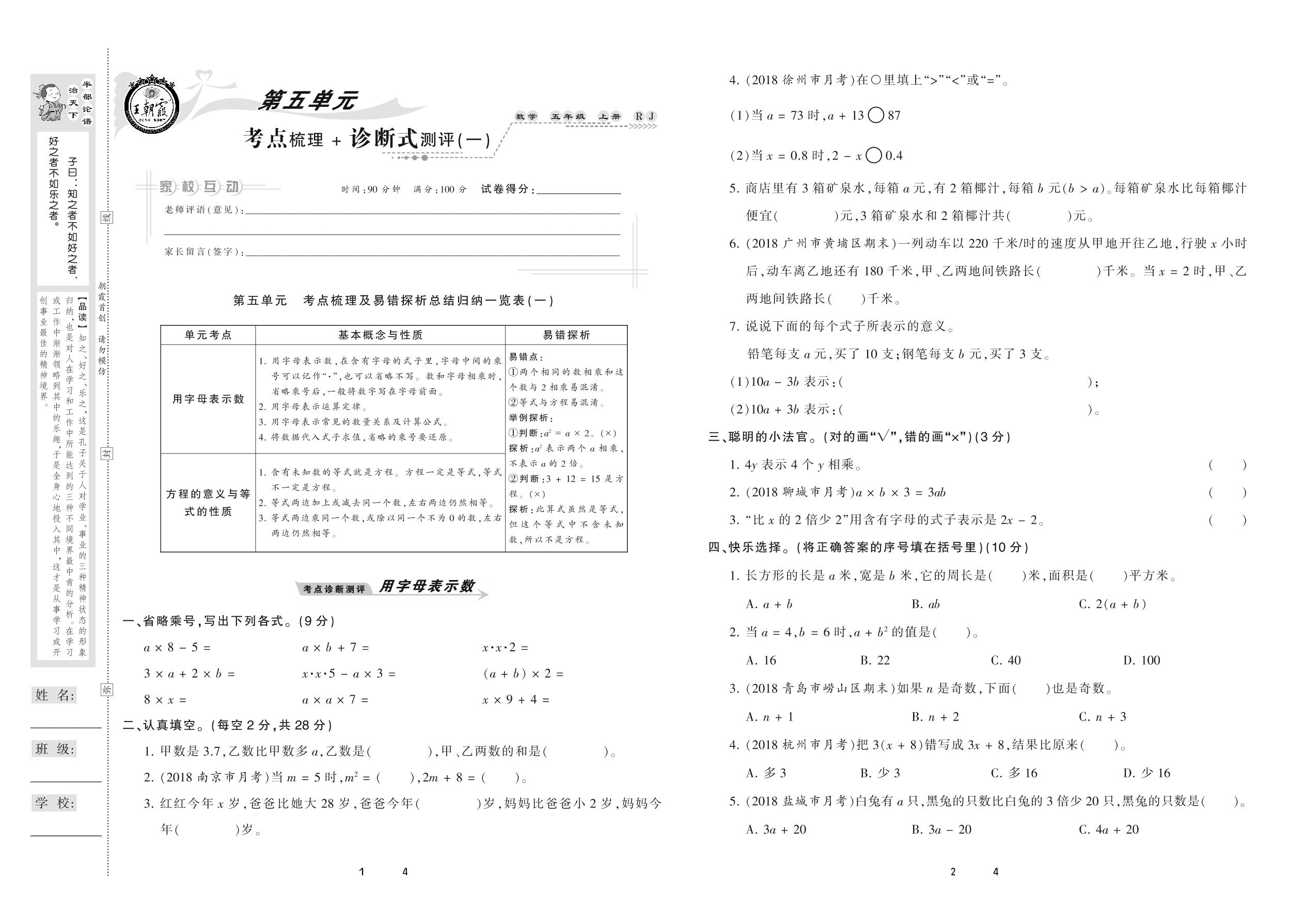 2020上册五年级数学人教版 第五单元 考点梳理+诊断式测评(一)