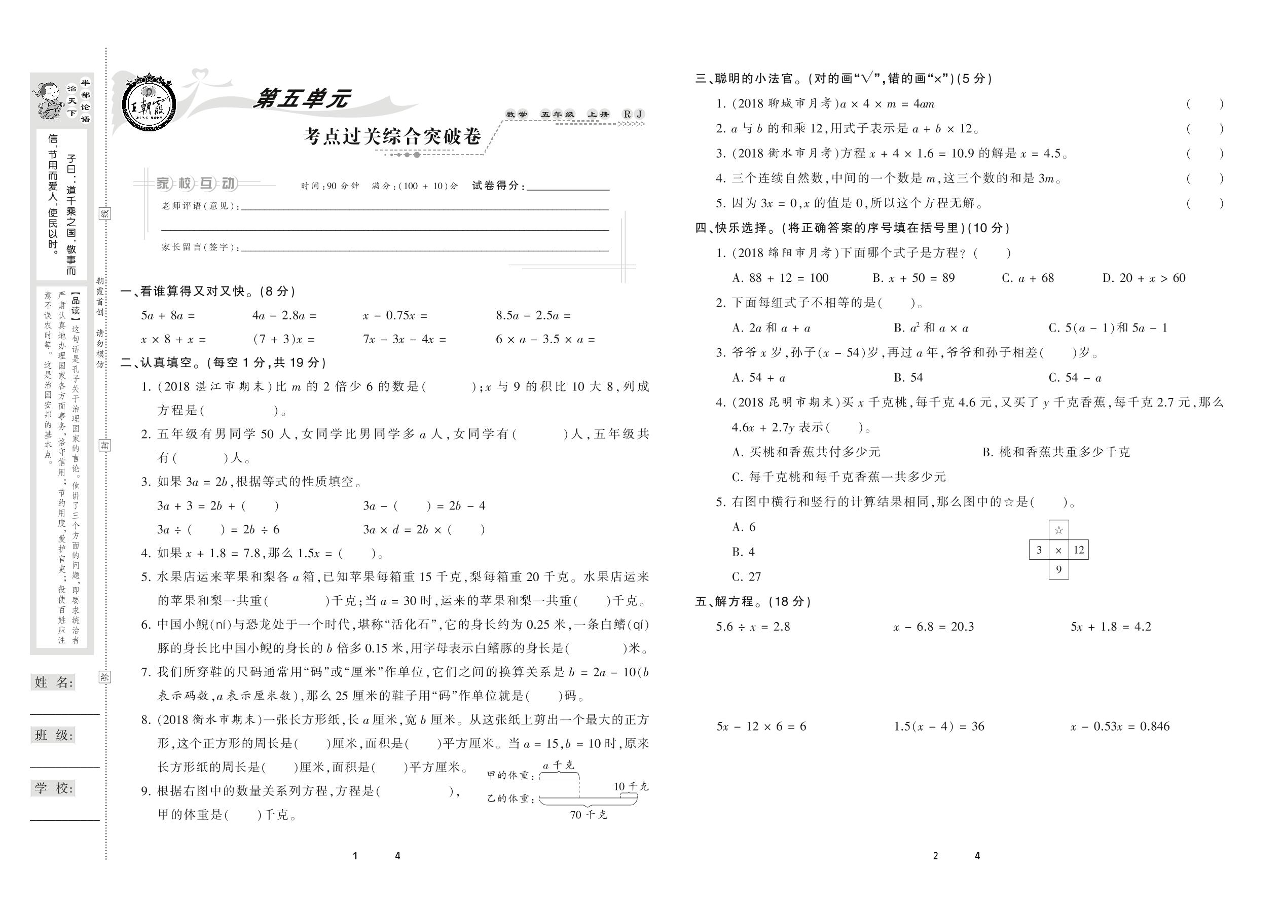 五年级数学人教版上册单元卷
