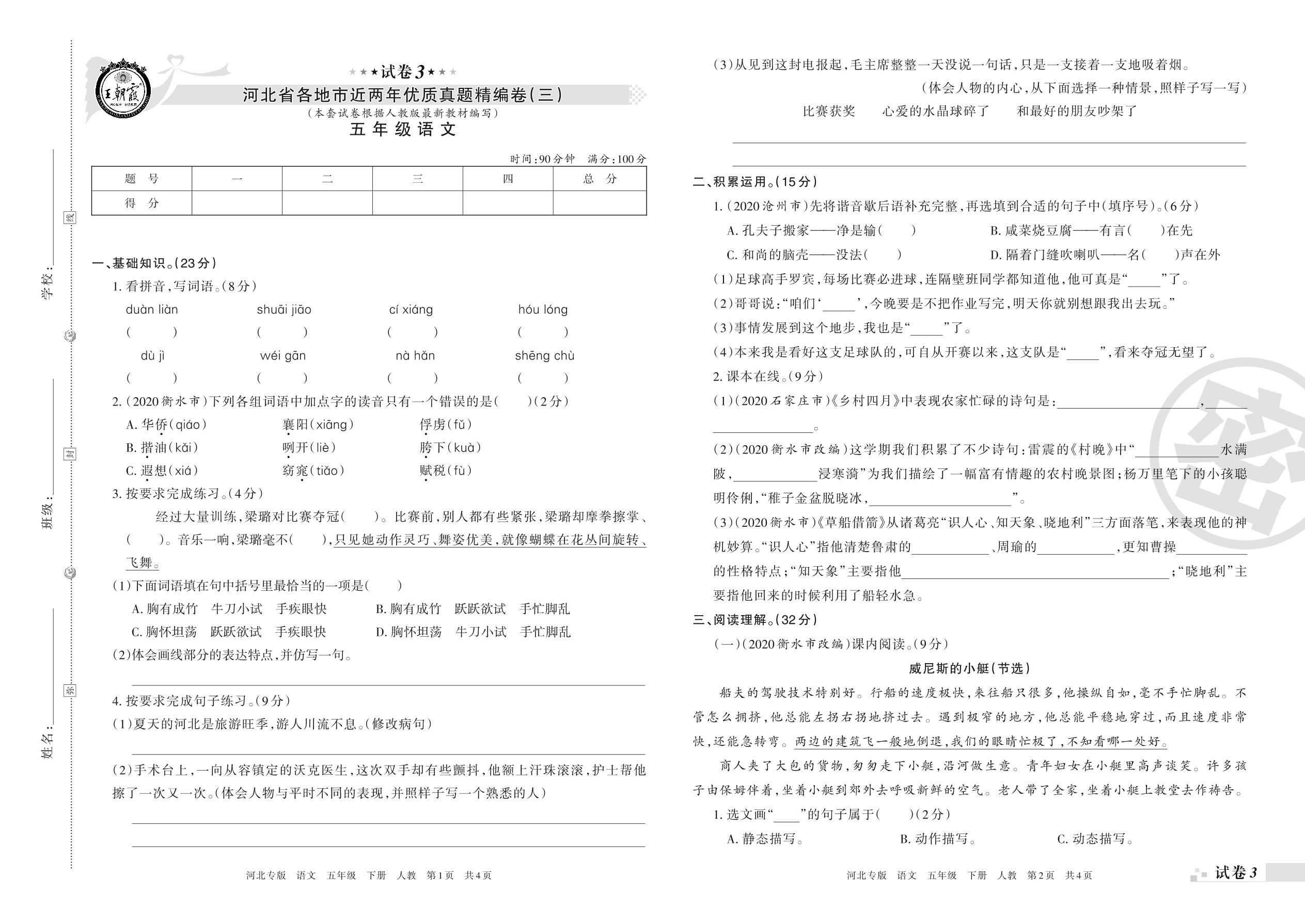 河北省各地市近两年优质真题精编卷(三)五年级下册语文(人教版)【3】