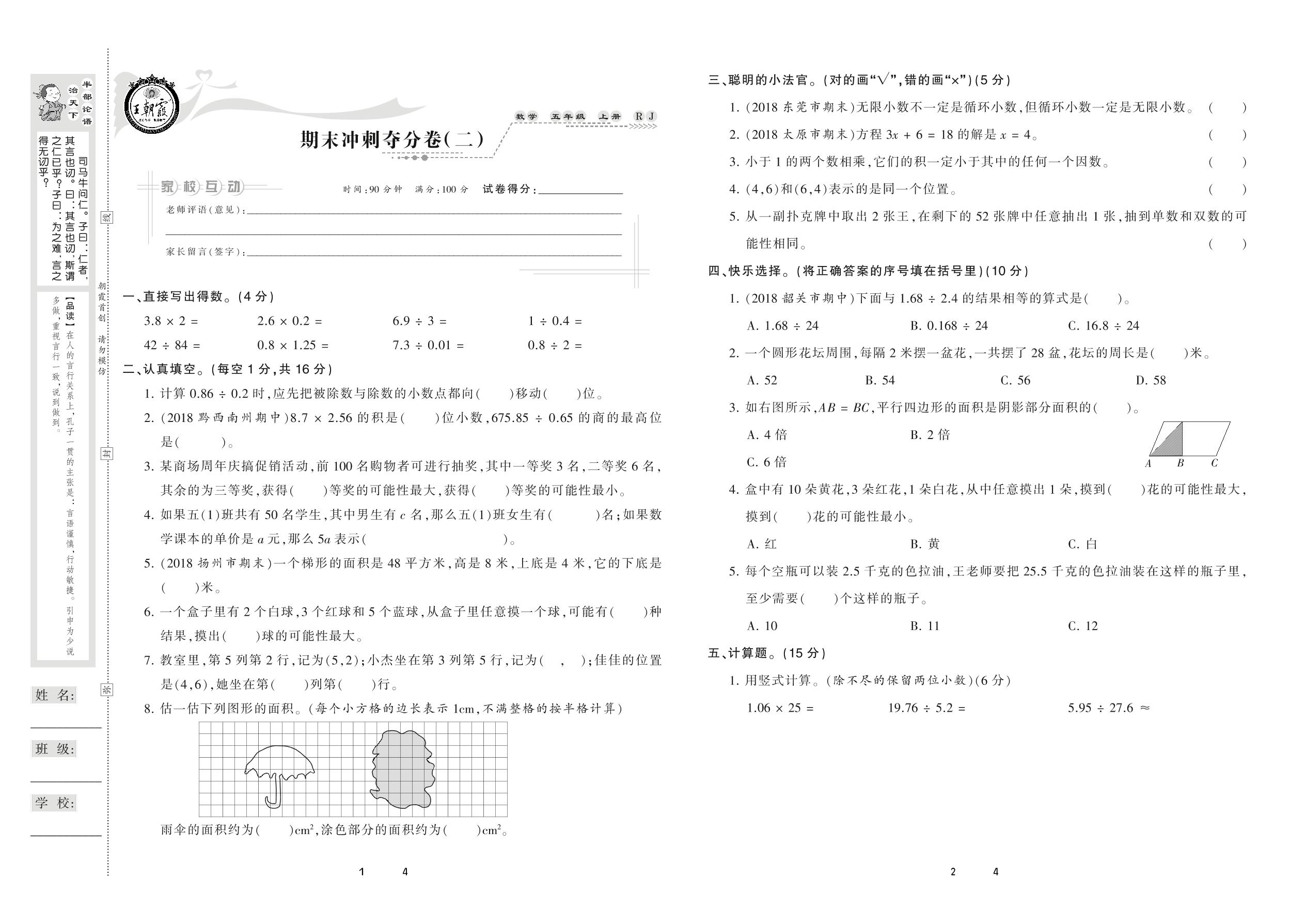 2020上册五年级数学人教版 期末冲刺夺分卷(二)