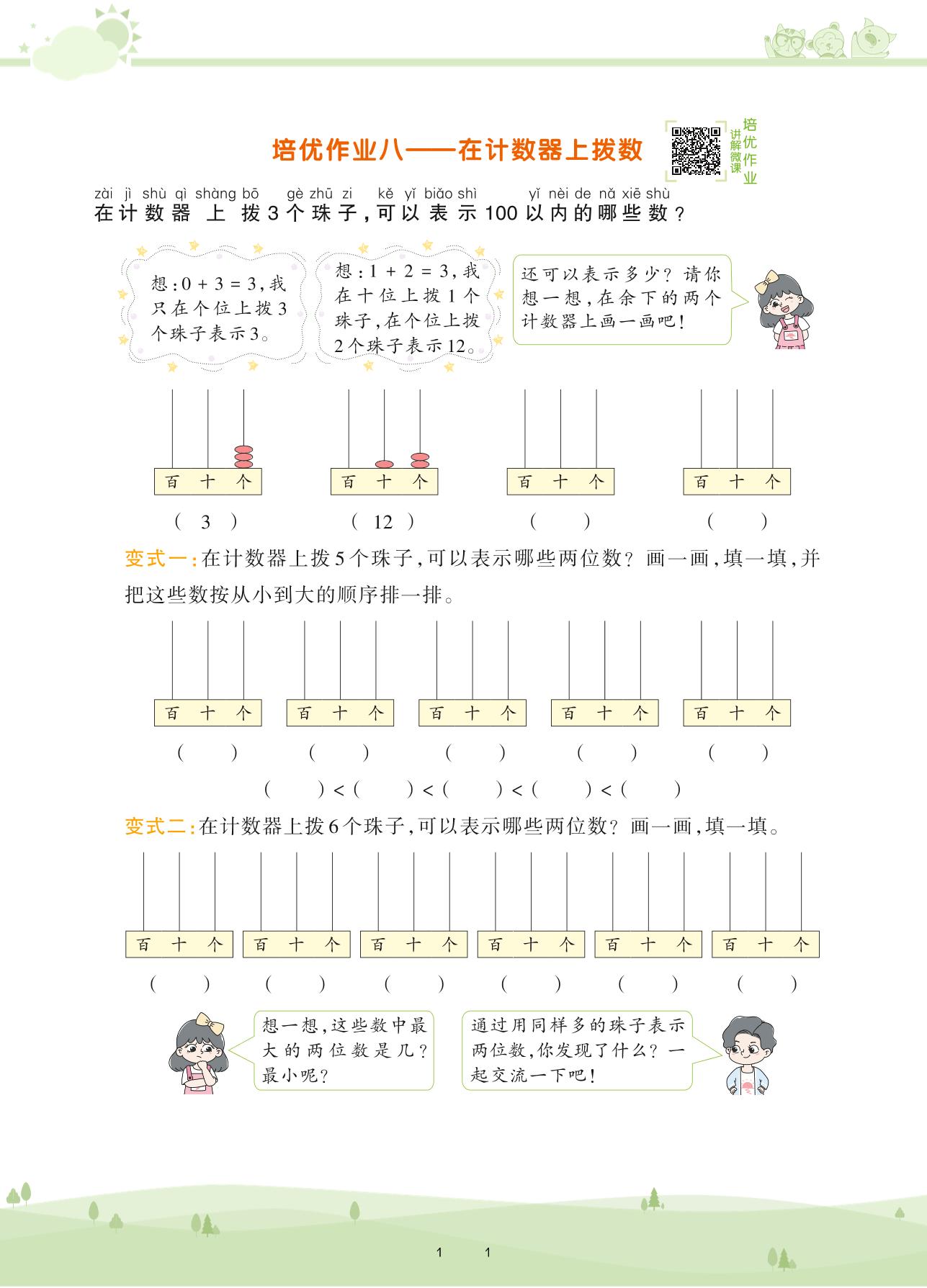 2021下册一年级数学苏教版 第三单元 认识100以内的数——培优作业八 在计数器上拨数