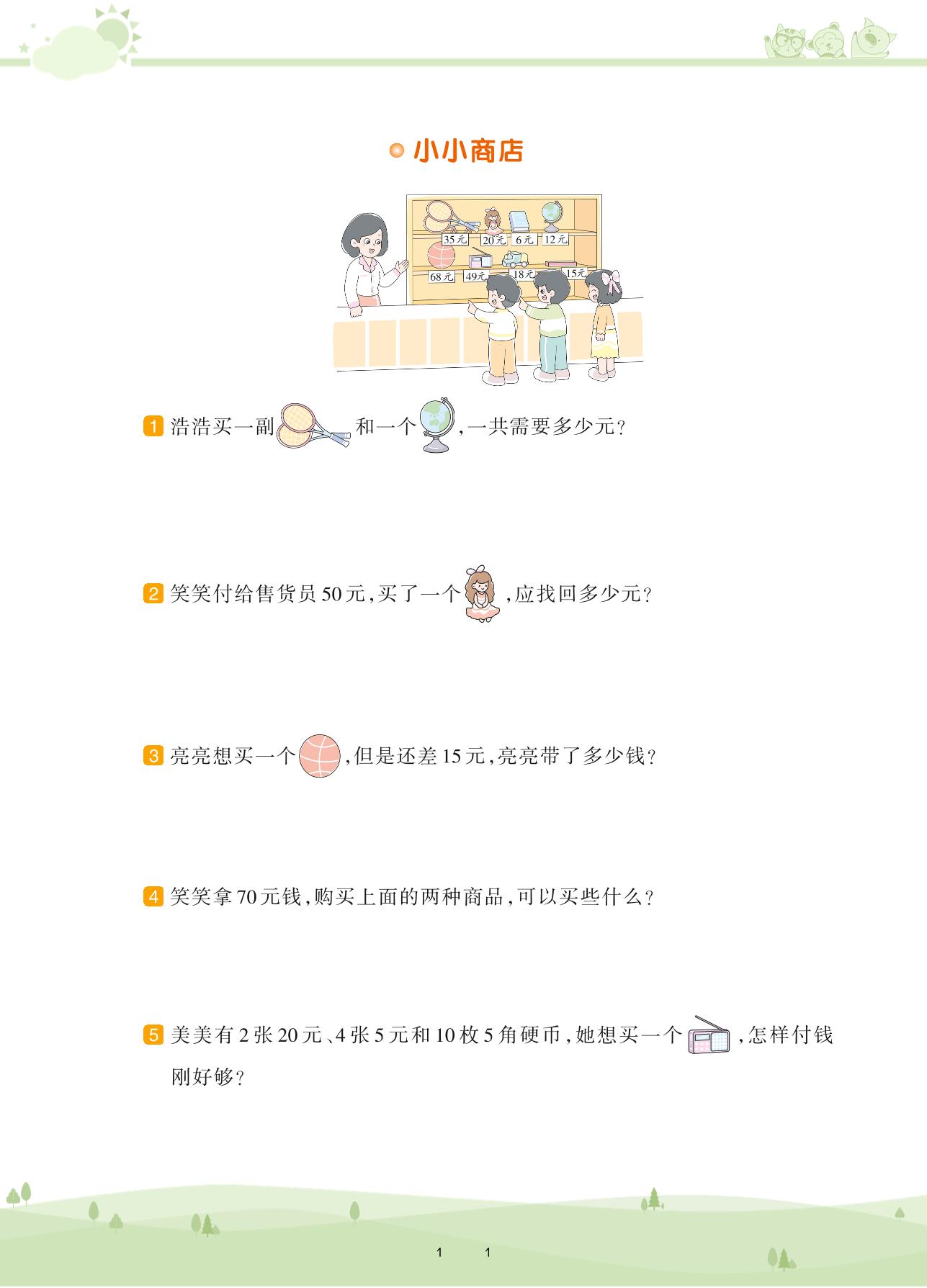 2021下册一年级数学苏教版 第五单元 元、角、分——小小商店