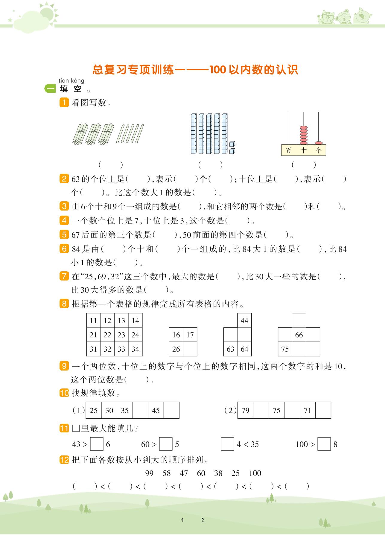 2021下册一年级数学苏教版 第七单元 期末复习——100以内数的认识