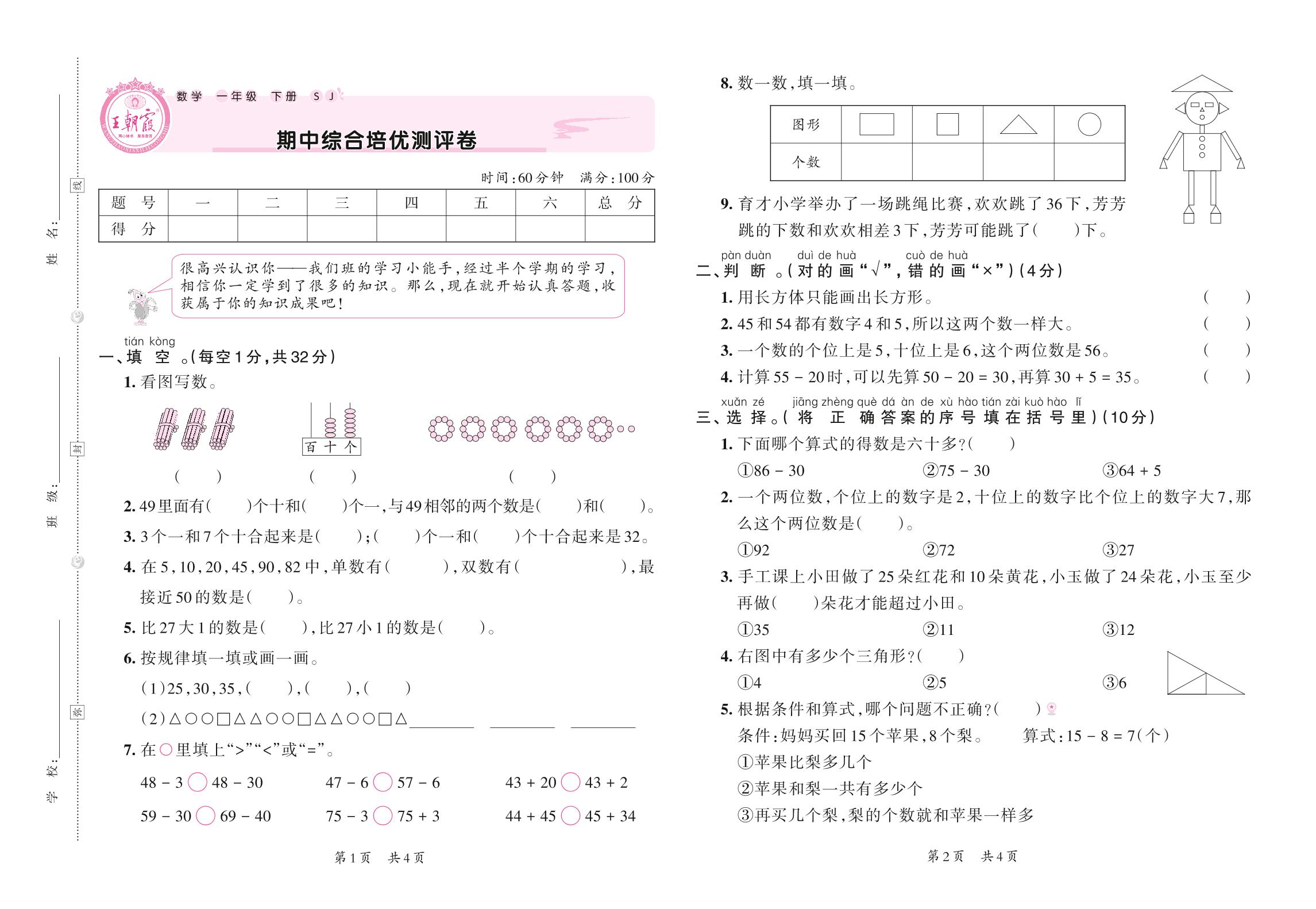 一年级数学苏教版下册期中卷