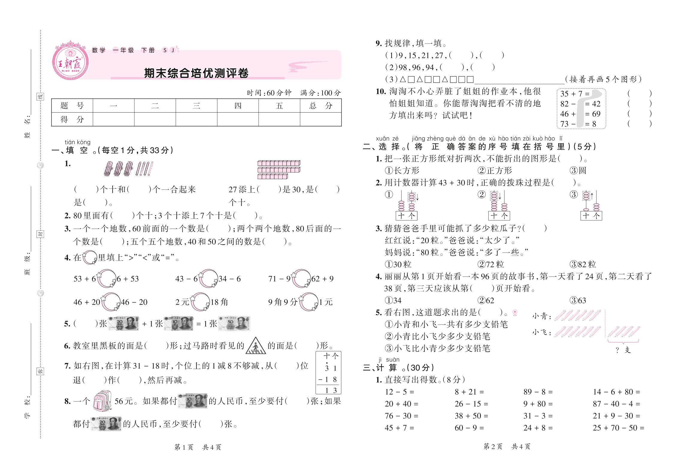 2021下册一年级数学苏教版 期末综合培优测评卷