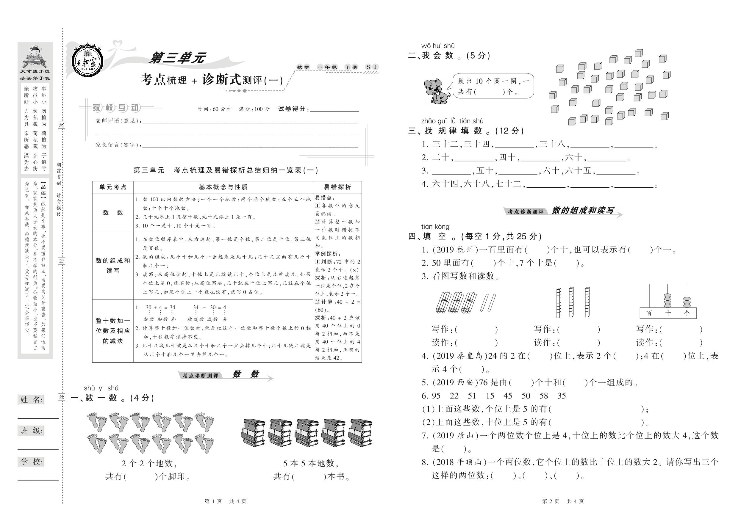 2021下册一年级数学苏教版 第三单元 考点梳理 + 诊断式测评(一)