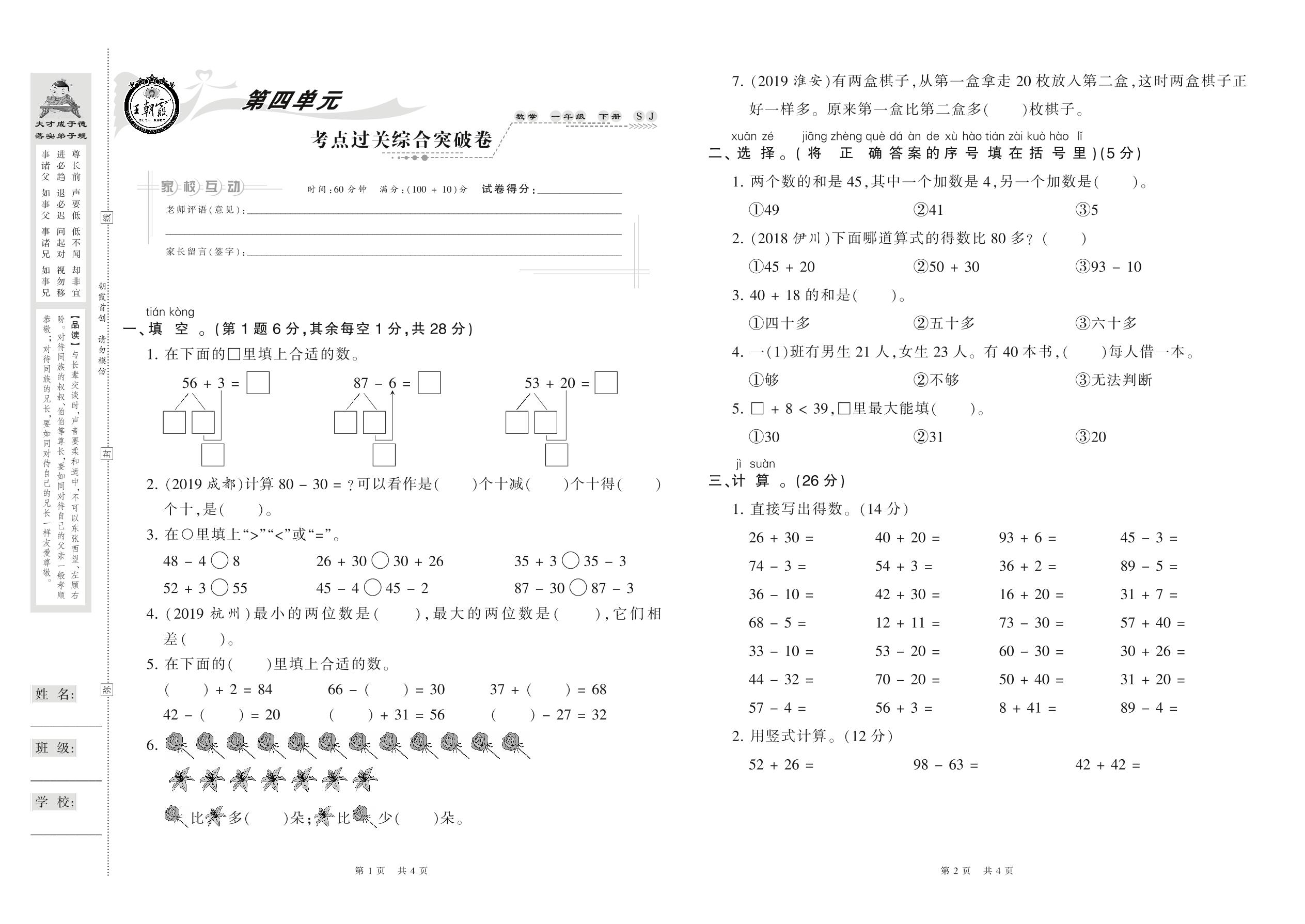 2021下册一年级数学苏教版 第四单元 考点过关综合突破卷