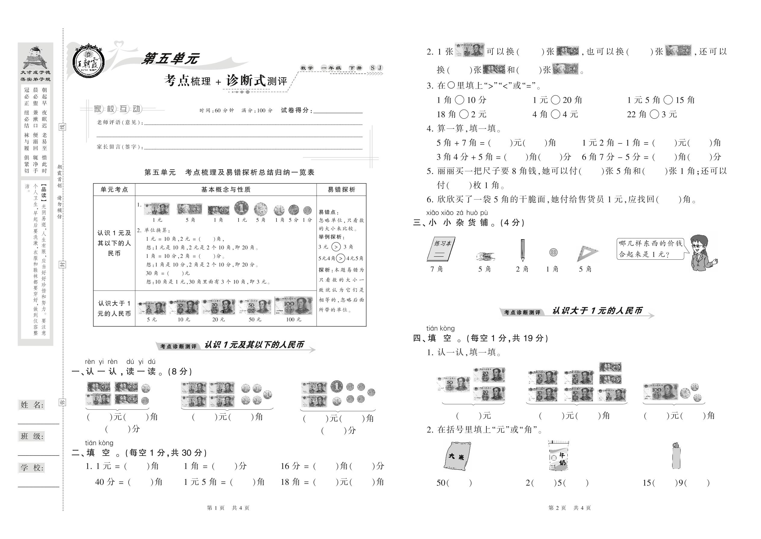 2021下册一年级数学苏教版 第五单元 考点梳理 + 诊断式测评