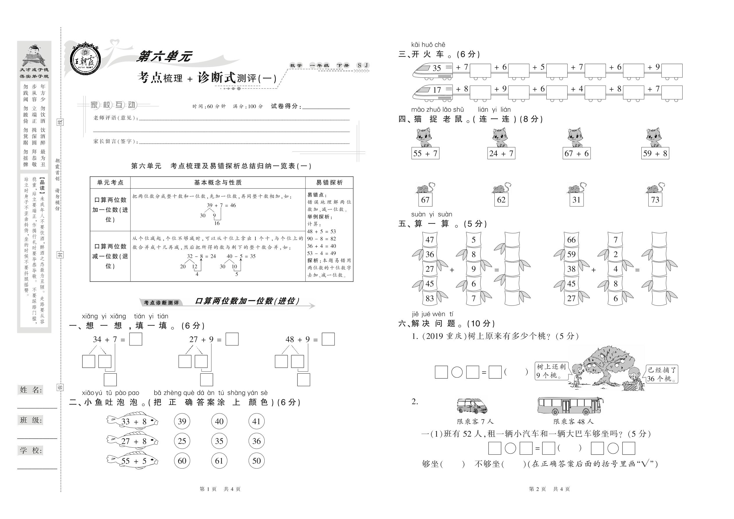 2021下册一年级数学苏教版 第六单元 考点梳理 + 诊断式测评(一)
