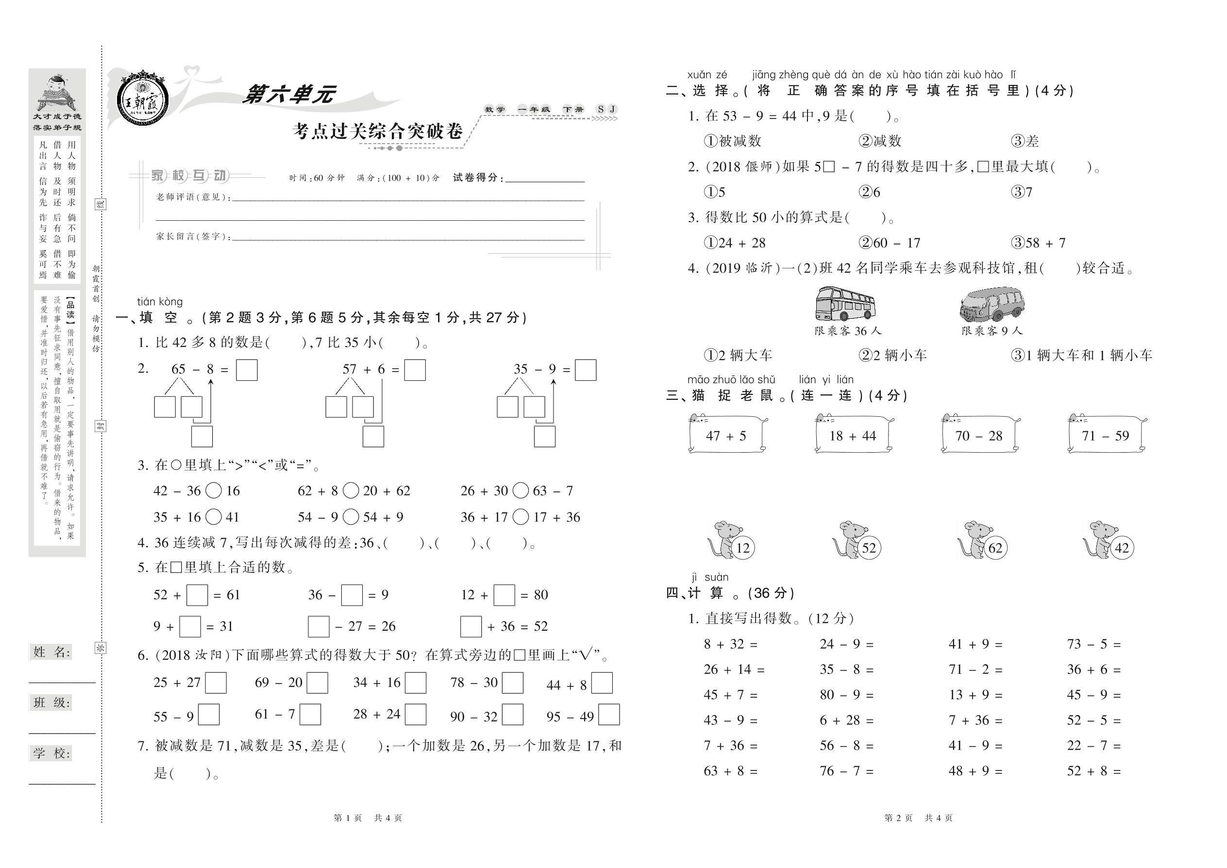 2021下册一年级数学苏教版 第六单元 考点过关综合突破卷