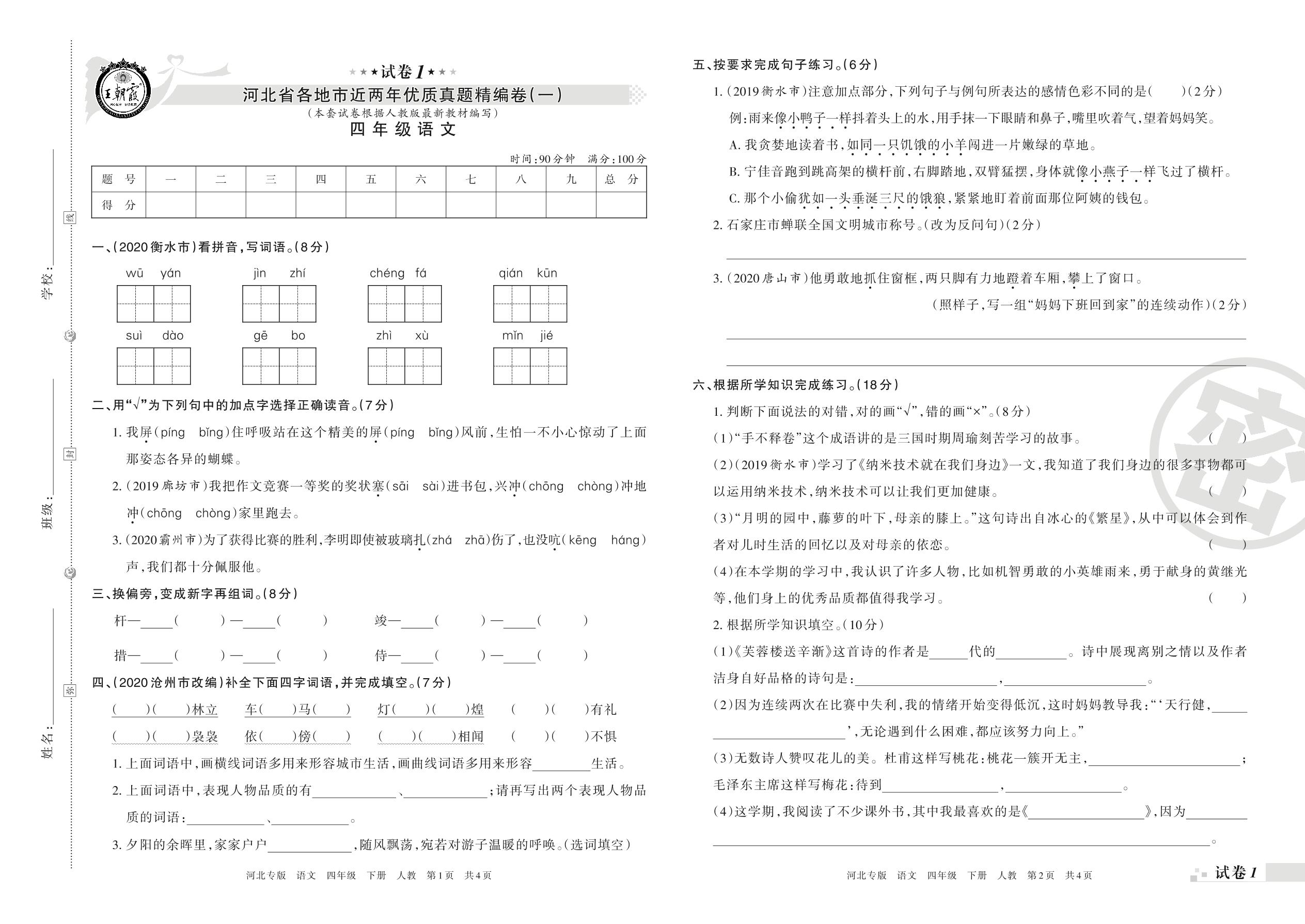 河北省各地市近两年优质真题精编卷(一)四年级下册语文(人教版)【1】