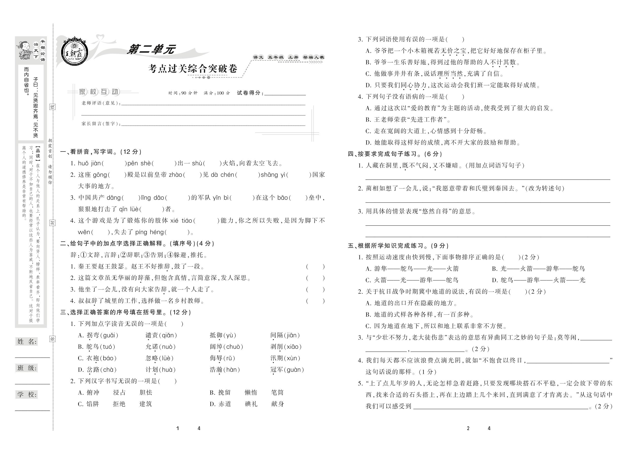 2020上册五年级语文人教版 第二单元 考点过关综合突破卷