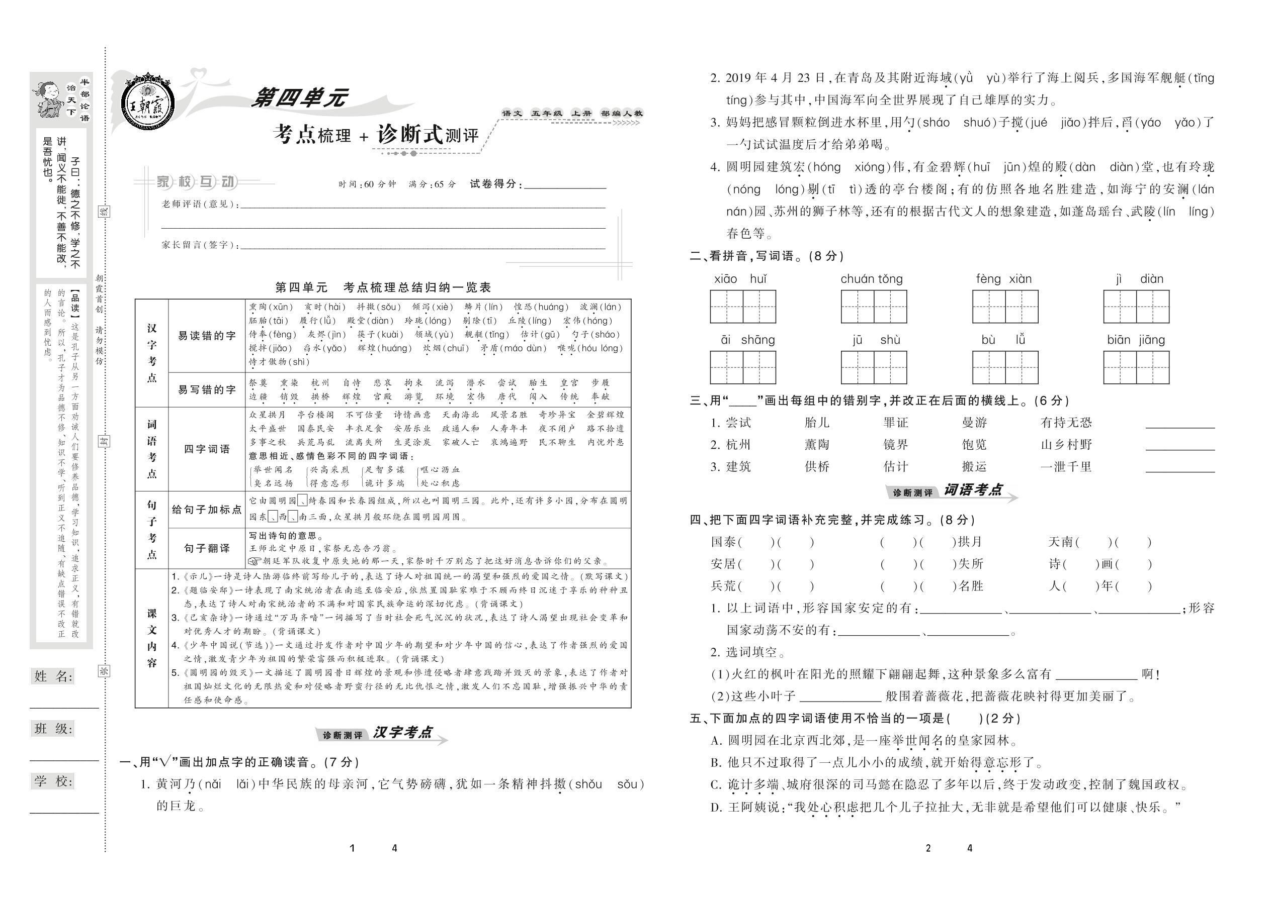 2020上册五年级语文人教版 第四单元 考点梳理+诊断式测评