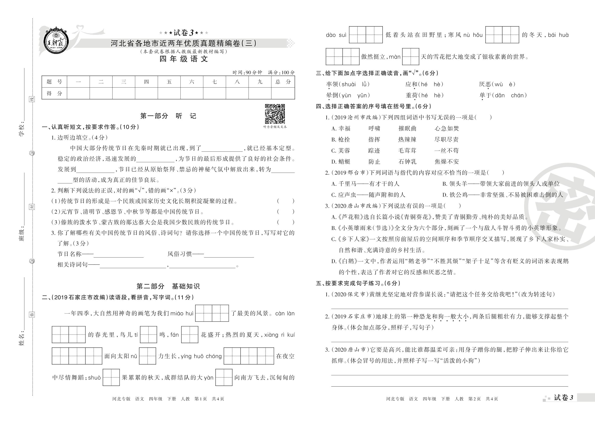 河北省各地市近两年优质真题精编卷(三)四年级下册语文(人教版)【3】