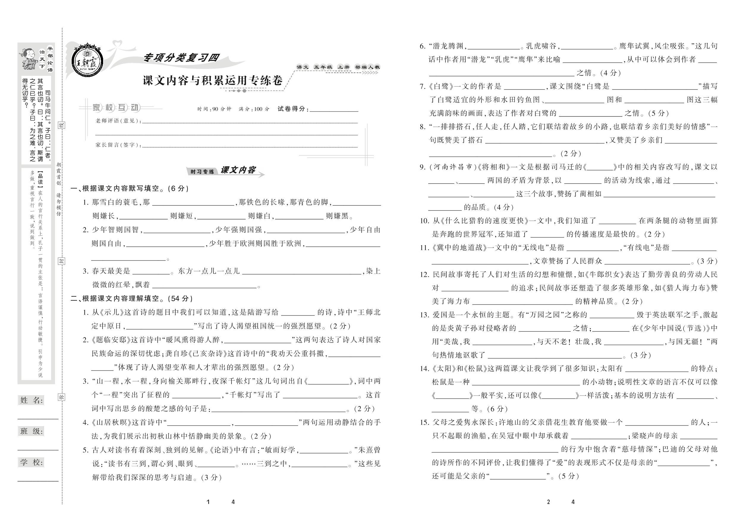 2020上册五年级语文人教版 课文内容与积累运用专练卷