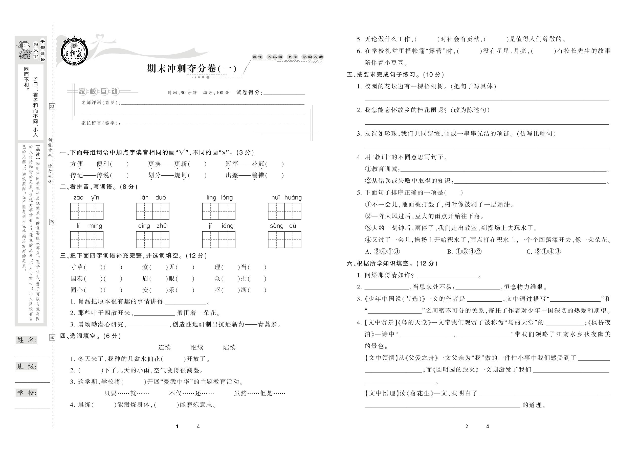 2020上册五年级语文人教版 期末冲刺夺分卷(一)