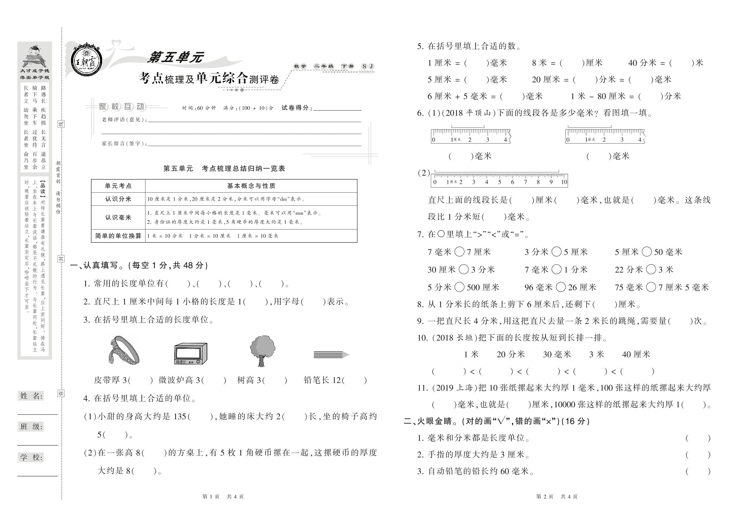 2021下册二年级数学苏教版 第五单元 考点梳理及单元综合测评卷