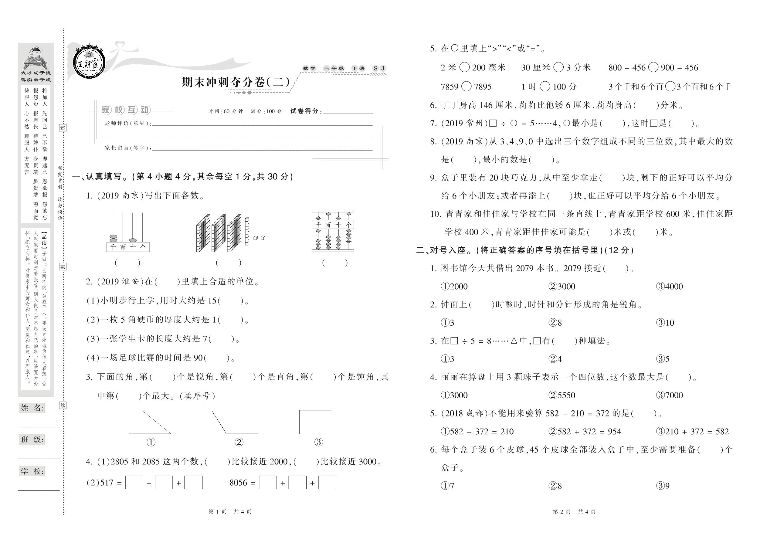 2021下册二年级数学苏教版 期末冲刺夺分卷(二)