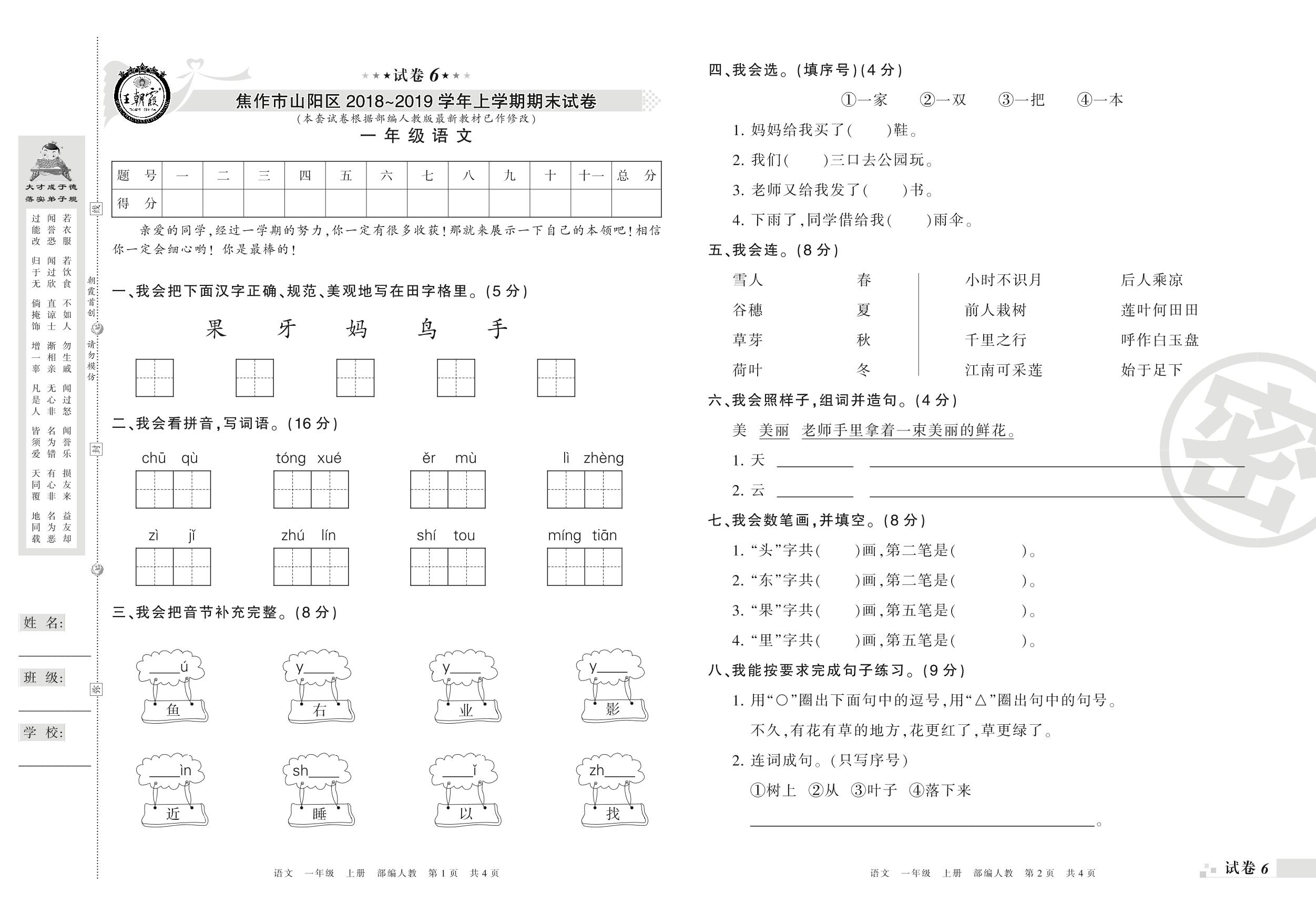 2018-2019学年第一学期焦作市山阳区一年级语文试卷(人教版)【6】