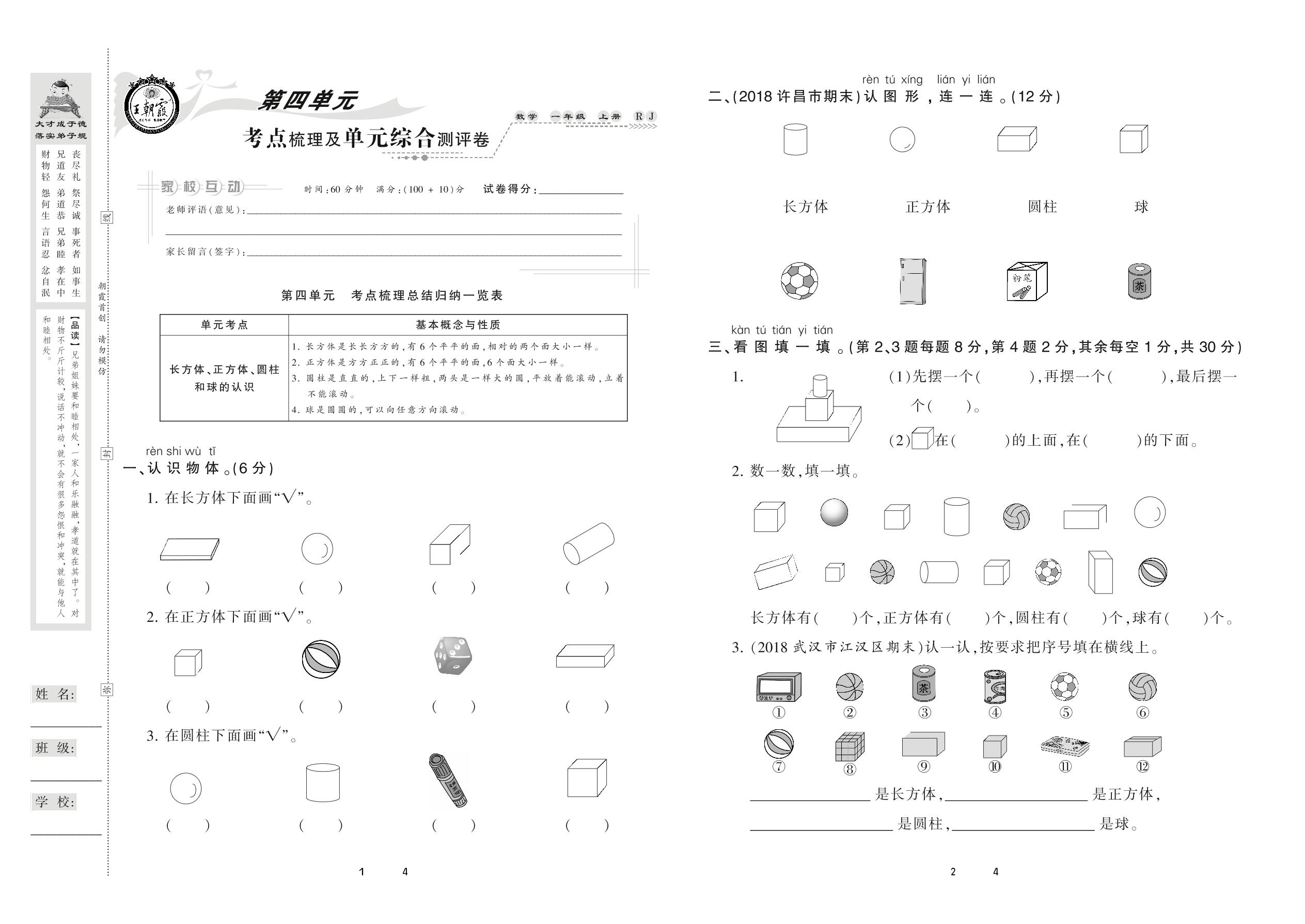 2020上册一年级数学人教版 第四单元 考点梳理及单元综合测评卷