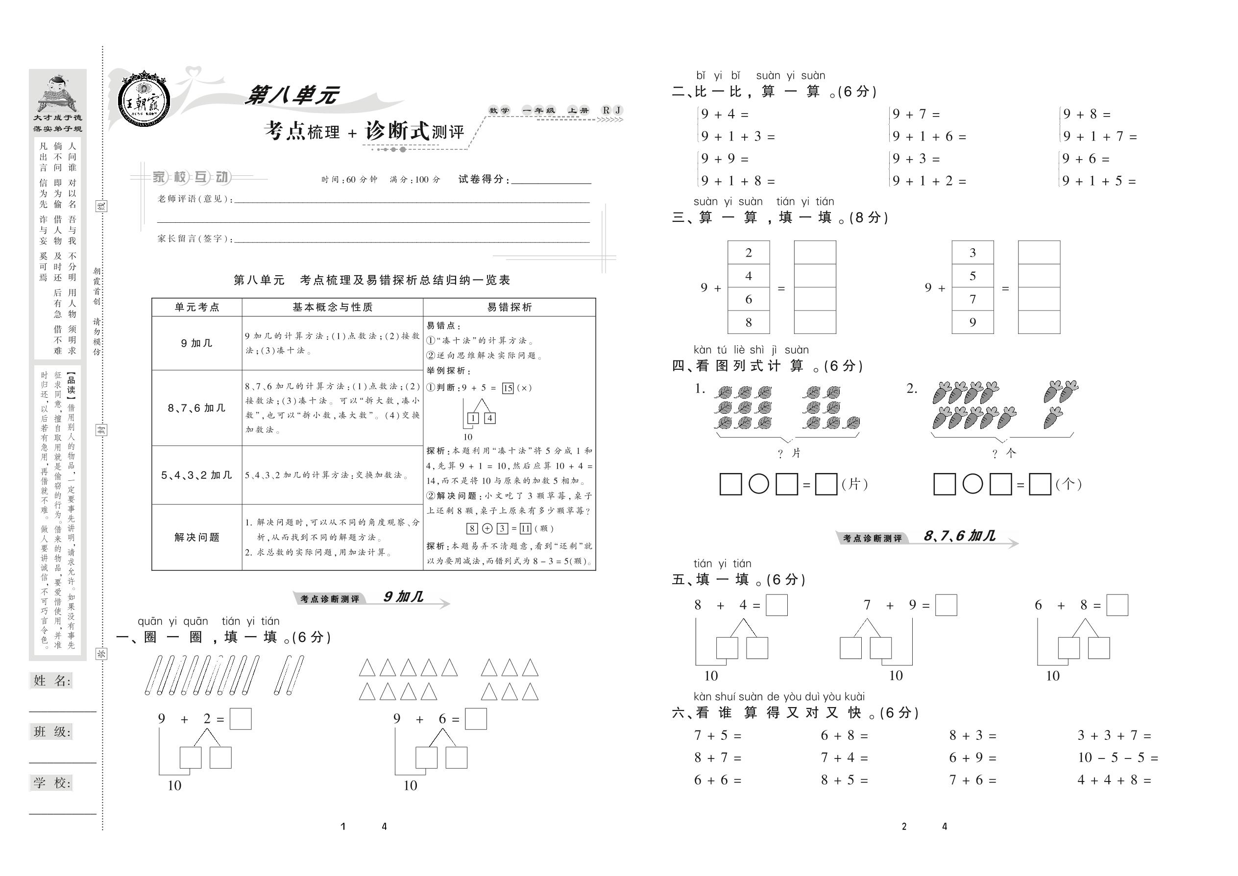 2020上册一年级数学人教版 第八单元 考点梳理+诊断式测评