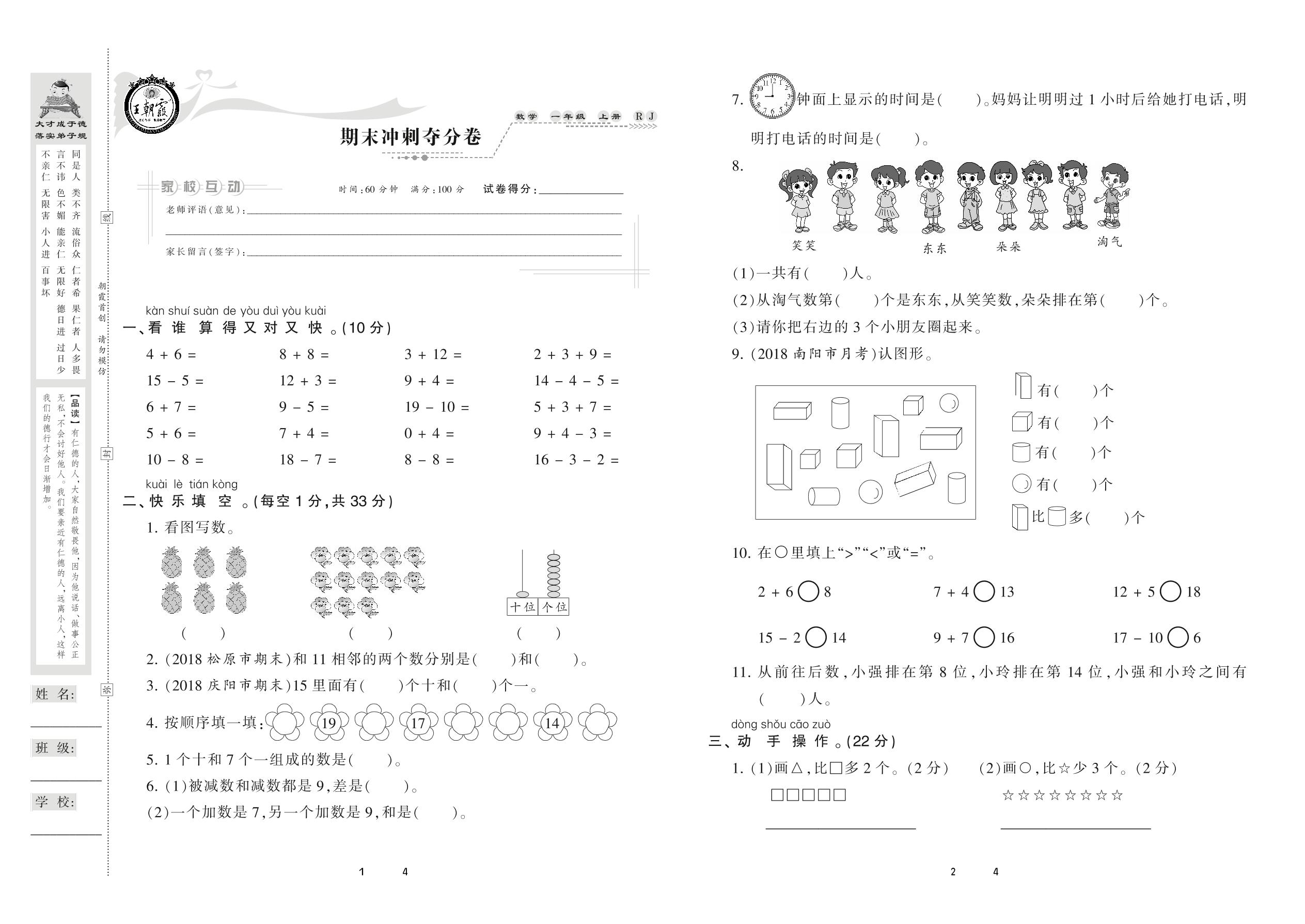 2020上册一年级数学人教版 期末冲刺夺分卷