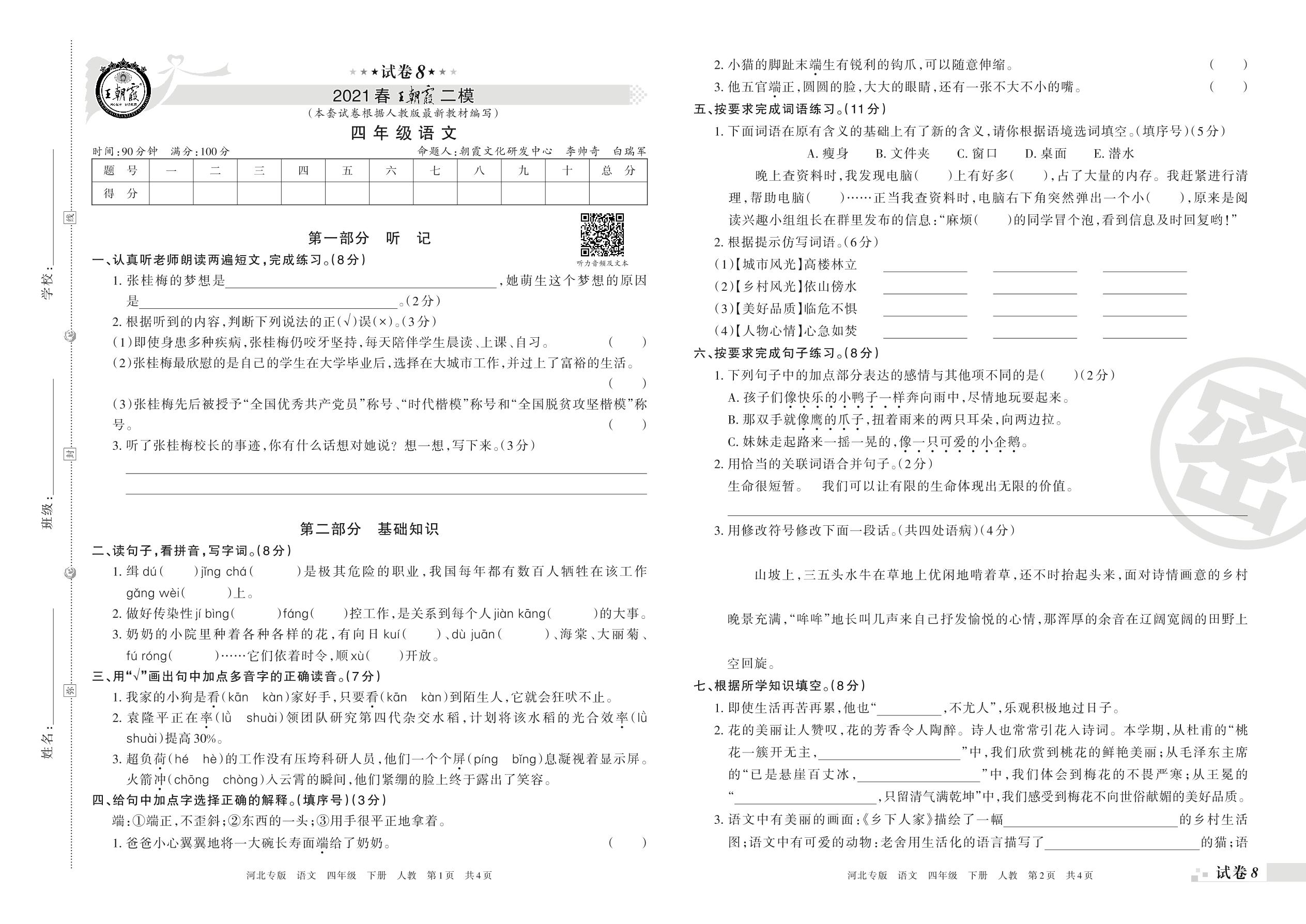 王朝霞期末模拟卷四年级下册语文(人教版)_R210801183213【8】