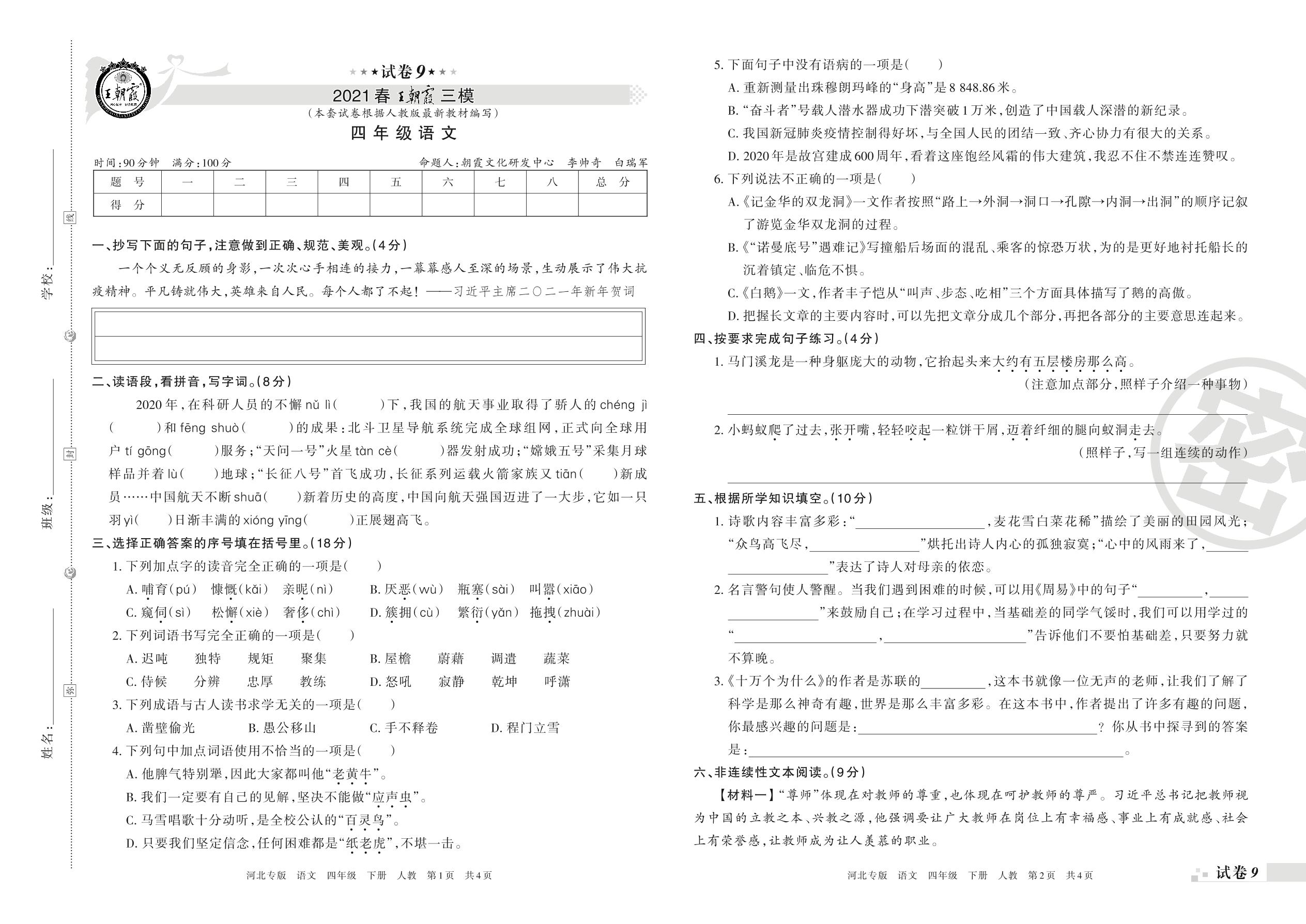 王朝霞期末模拟卷四年级下册语文(人教版)_R210801183220【9】