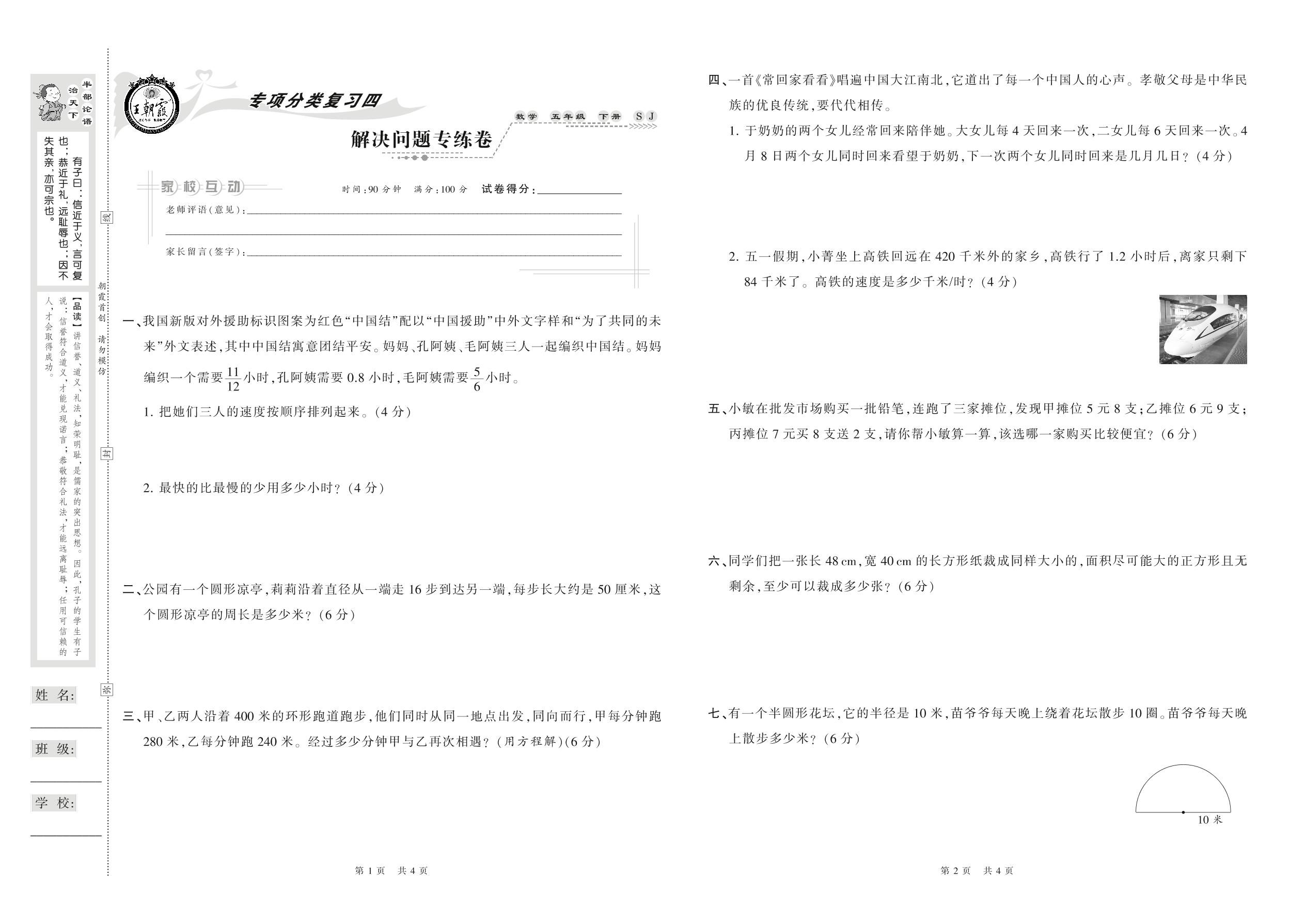 2021下册五年级数学苏教版 解决问题专练卷